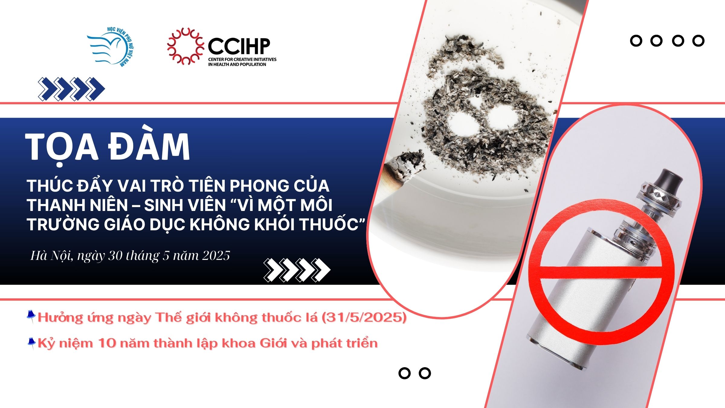 Sự kiện do Học viện Phụ nữ Việt Nam chủ trì tổ chức, với sự tham dự của đại diện Bộ Y tế, Tổ chức Y tế thế giới (WHO), Quỹ Phòng chống tác hại thuốc lá, Trung tâm Sáng kiến Sức khỏe và Dân số (CCIHP), cùng đông đảo cán bộ, giảng viên, nghiên cứu viên và sinh viên Học viện.