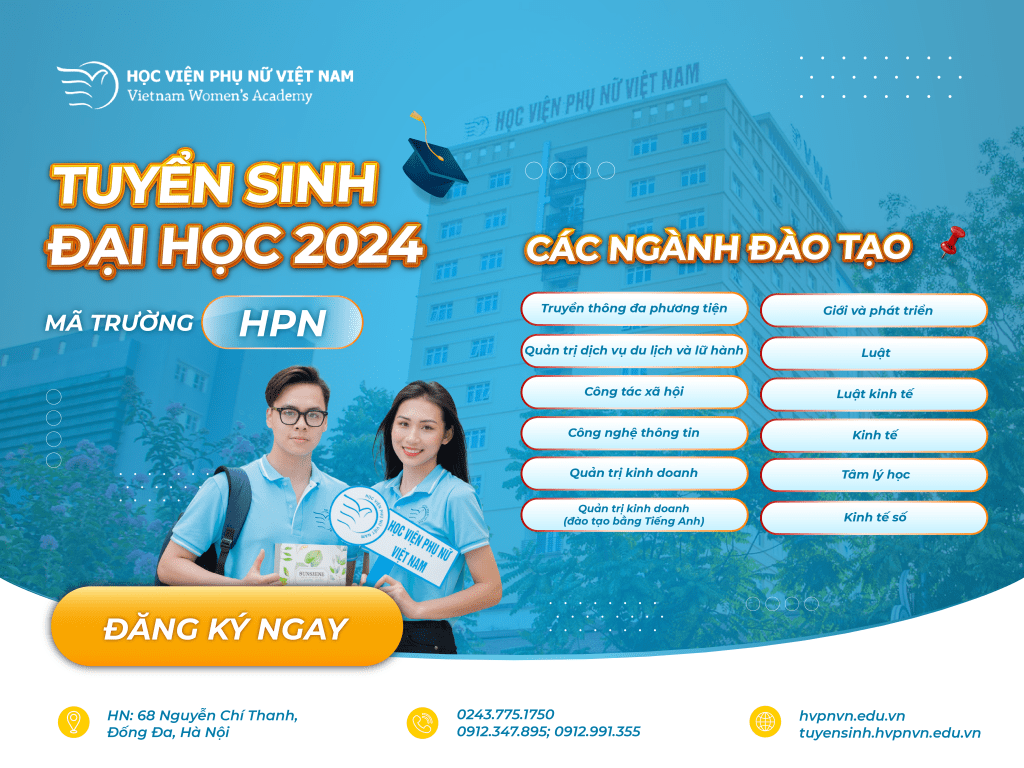 Học viện Phụ nữ Việt Nam thông báo ngưỡng điểm nhận hồ sơ xét tuyển đại học chính quy đào tạo tại Hà Nội năm 2024 theo kết quả thi tốt nghiệp THPT năm 2024 (xét tuyển theo tổ hợp).