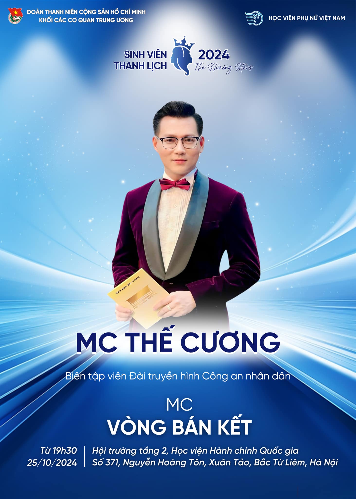 Cuối cùng, không thể không nhắc đến MC Thế Cương, một gương mặt quen thuộc với khán giả truyền hình, đặc biệt là qua các chương trình của Đài Truyền hình Công an Nhân dân (ANTV). Anh nổi tiếng với phong cách dẫn chương trình chuyên nghiệp, tự tin và cuốn hút. Với kinh nghiệm nhiều năm trong lĩnh vực truyền thông và dẫn chương trình, MC Thế Cương sẽ không chỉ góp phần làm nên không khí sôi động, hấp dẫn cho sự kiện mà còn đóng vai trò quan trọng trong việc kết nối giữa thí sinh và khán giả, mang đến những khoảnh khắc đầy cảm xúc cho đêm thi bán kết.