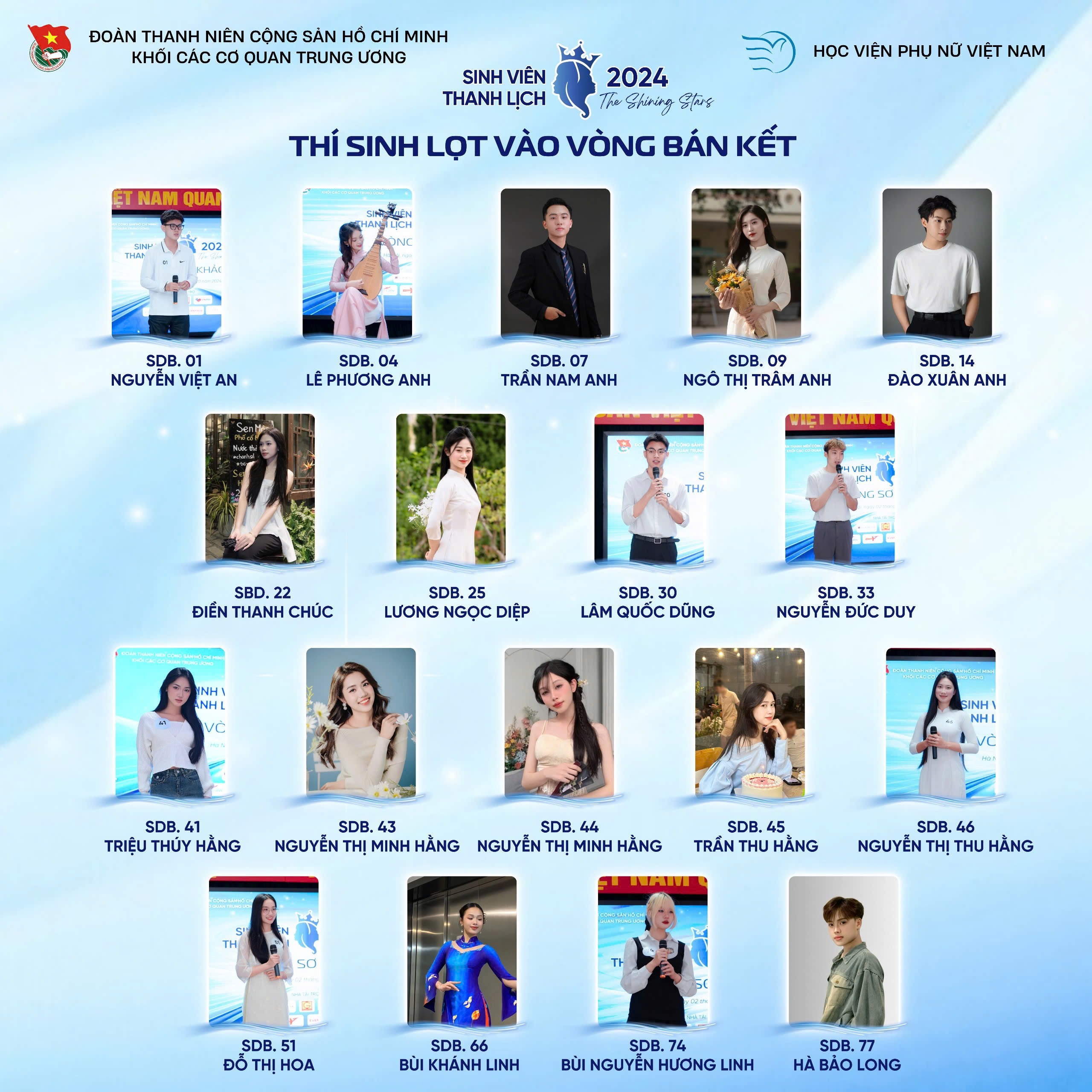 Sinh viên Thanh lịch 2024 là cuộc thi được Học viện Phụ nữ Việt Nam tổ chức hai năm một lần với mục tiêu mang đến cơ hội cho sinh viên thể hiện vẻ đẹp tri thức, tài năng và tỏa sáng trên hành trình tuổi trẻ. Từ hơn 200 thí sinh tham gia vòng sơ khảo, Ban tổ chức đã chọn ra 37 gương mặt xuất sắc chính thức bước vào vòng Bán kết. Những thí sinh này đã vượt qua các vòng thi cạnh tranh gay cấn, bao gồm các phần thi như chào hỏi, tài năng và ứng xử, nơi họ thể hiện sự bản lĩnh, tự tin và năng lực vượt trội.