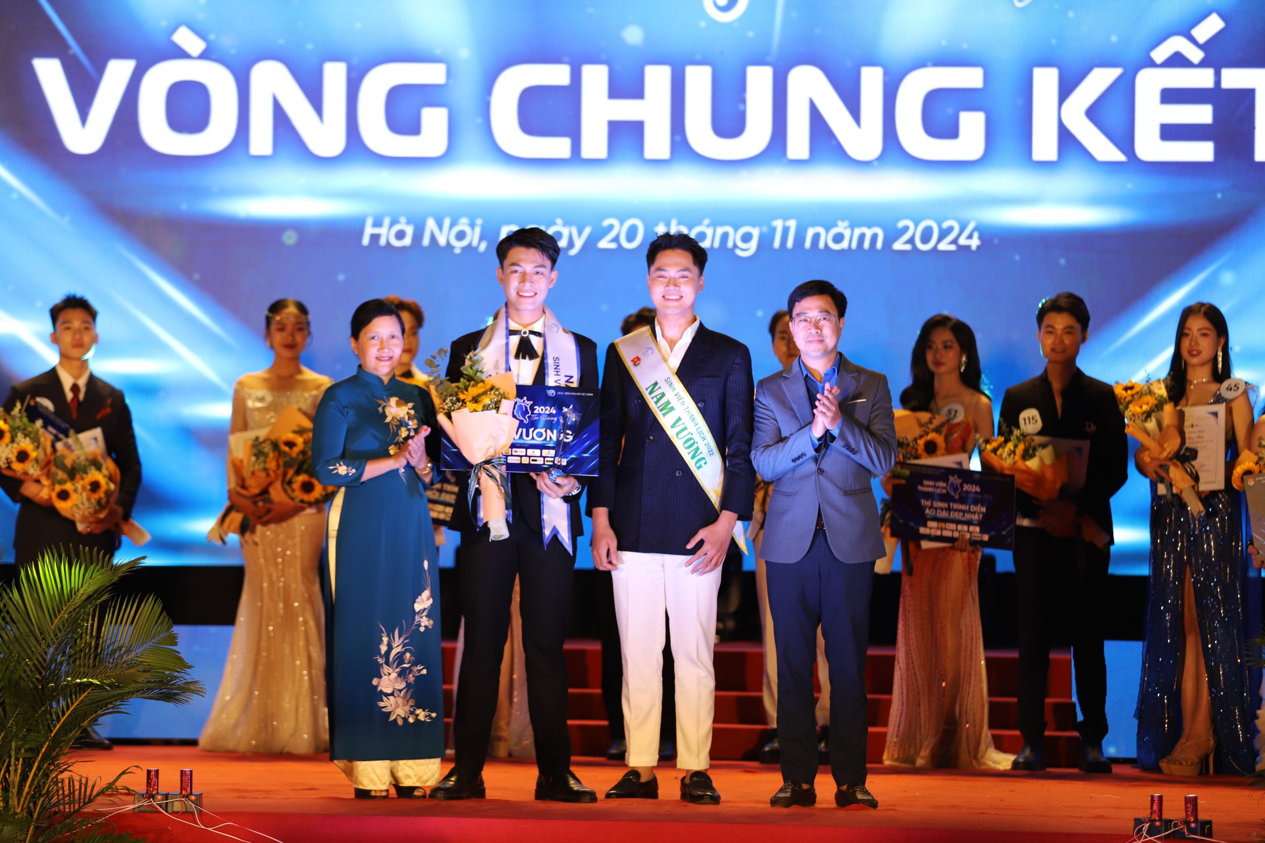 Đồng chí Hà Thị Thanh Vân – Phó Giám đốc Học viện Phụ nữ Việt Nam, Trưởng Ban Giám khảo; Nam vương 2022 Trần Quang Tú; Đồng chí Bùi Hoàng Tùng – Bí thư Đoàn TNCS Khối các cơ quan Trung ương trao danh hiệu Nam vương cuộc thi SVTL 2024 cho thí sinh Lâm Quốc Dũng
