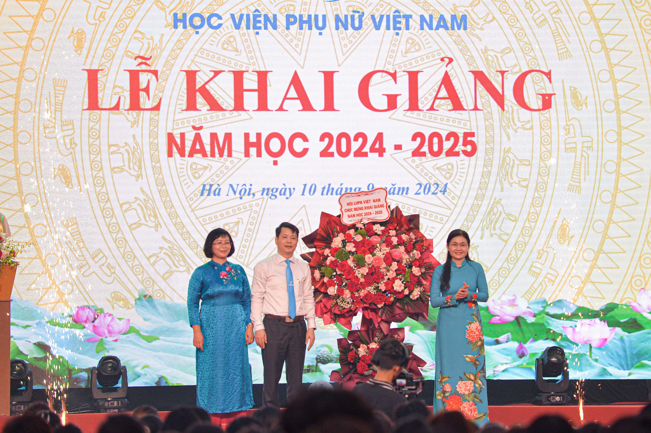 Đại diện lãnh đạo Hội Liên hiệp Phụ nữ Việt Nam, đồng chí Tôn Ngọc Hạnh, Ủy viên dự khuyết BCH TW Đảng, Phó Chủ tịch Hội LHPN Việt Nam đã trao tặng lẵng hoa tươi thắm đến Ban Giám đốc, tập thể thầy và trò Học viện thay lời chúc mừng nồng nhiệt nhất.
