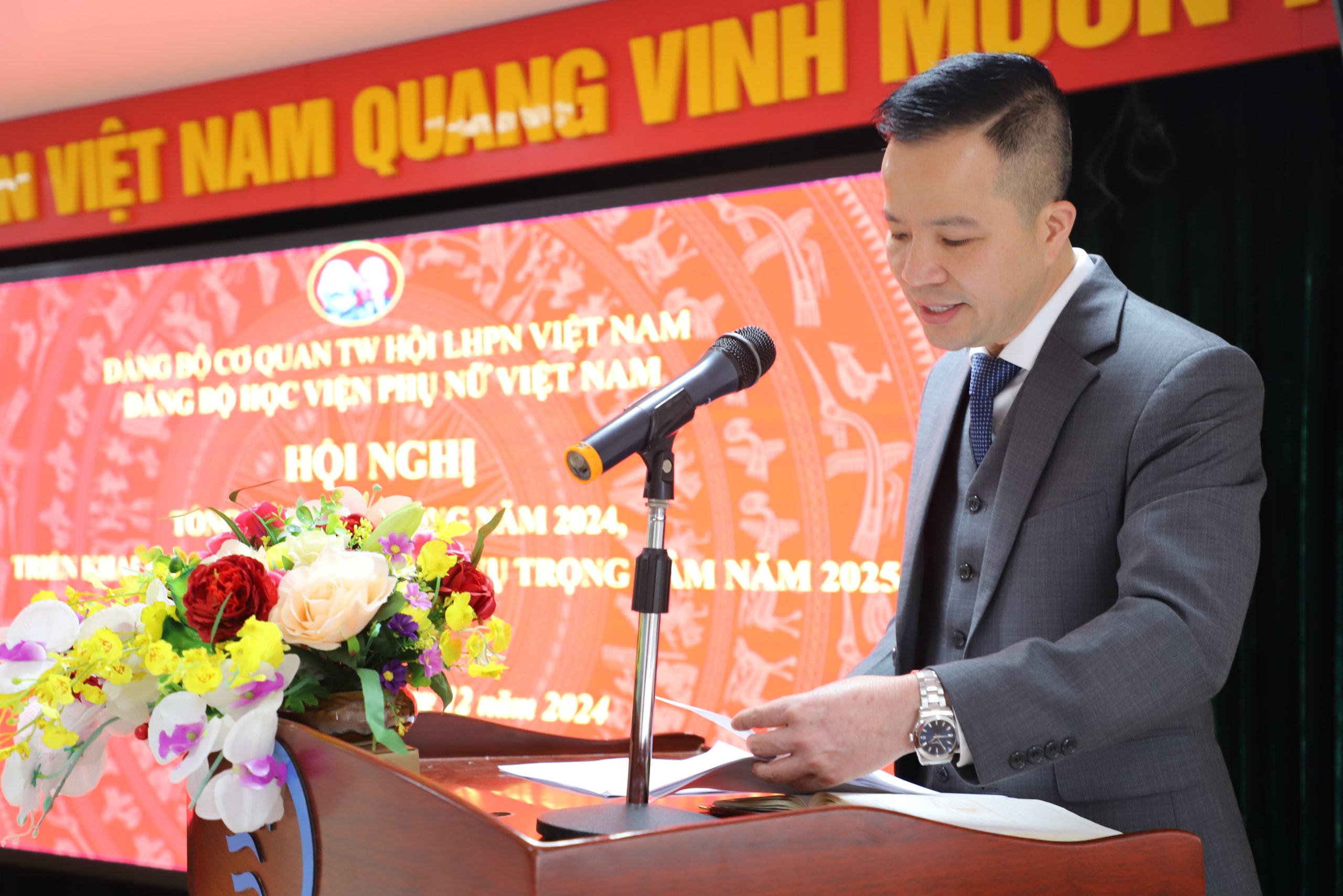 Phát biểu bế mạc, đồng chí Trần Quang Tiến, Bí thư Đảng ủy Học viện, đã nhấn mạnh: “Những thành quả đạt được trong năm 2024 là kết quả của tinh thần đoàn kết, nỗ lực không ngừng của toàn thể đảng viên và quần chúng ưu tú. Những sáng kiến và kinh nghiệm được chia sẻ tại hội nghị sẽ là động lực để toàn Đảng bộ cùng phấn đấu, đạt được những mục tiêu lớn trong năm tới và tiếp tục phát huy truyền thống tốt đẹp, xây dựng Đảng bộ Học viện Phụ nữ Việt Nam vững mạnh hơn nữa.”