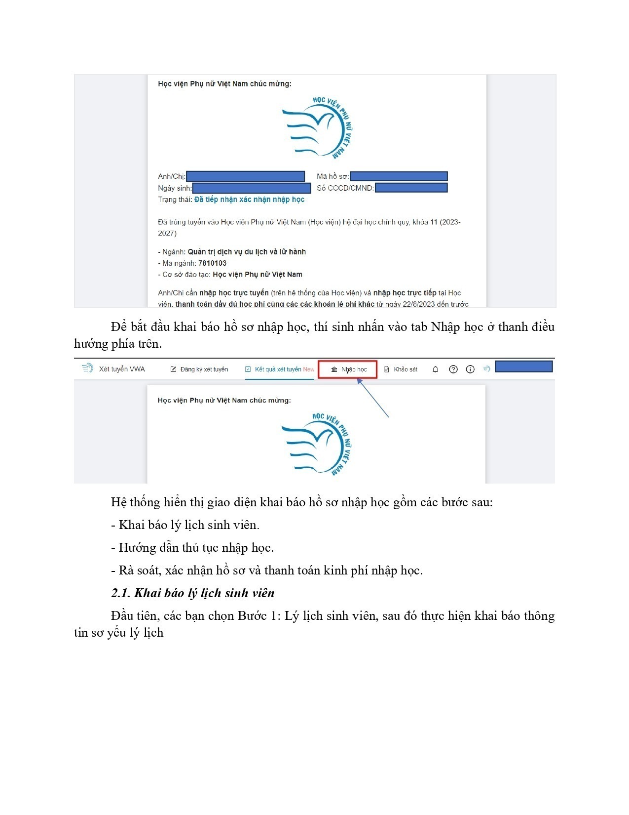 Bước 3: Thí sinh nhập học trực tiếp tại Học viện Phụ nữ Việt Nam. Thời gian nhập học từ ngày 19/8/2024 đến trước 17 giờ 00 ngày 27/8/2024. Hồ sơ nhập học thí sinh cần chuẩn bị xem TẠI ĐÂY