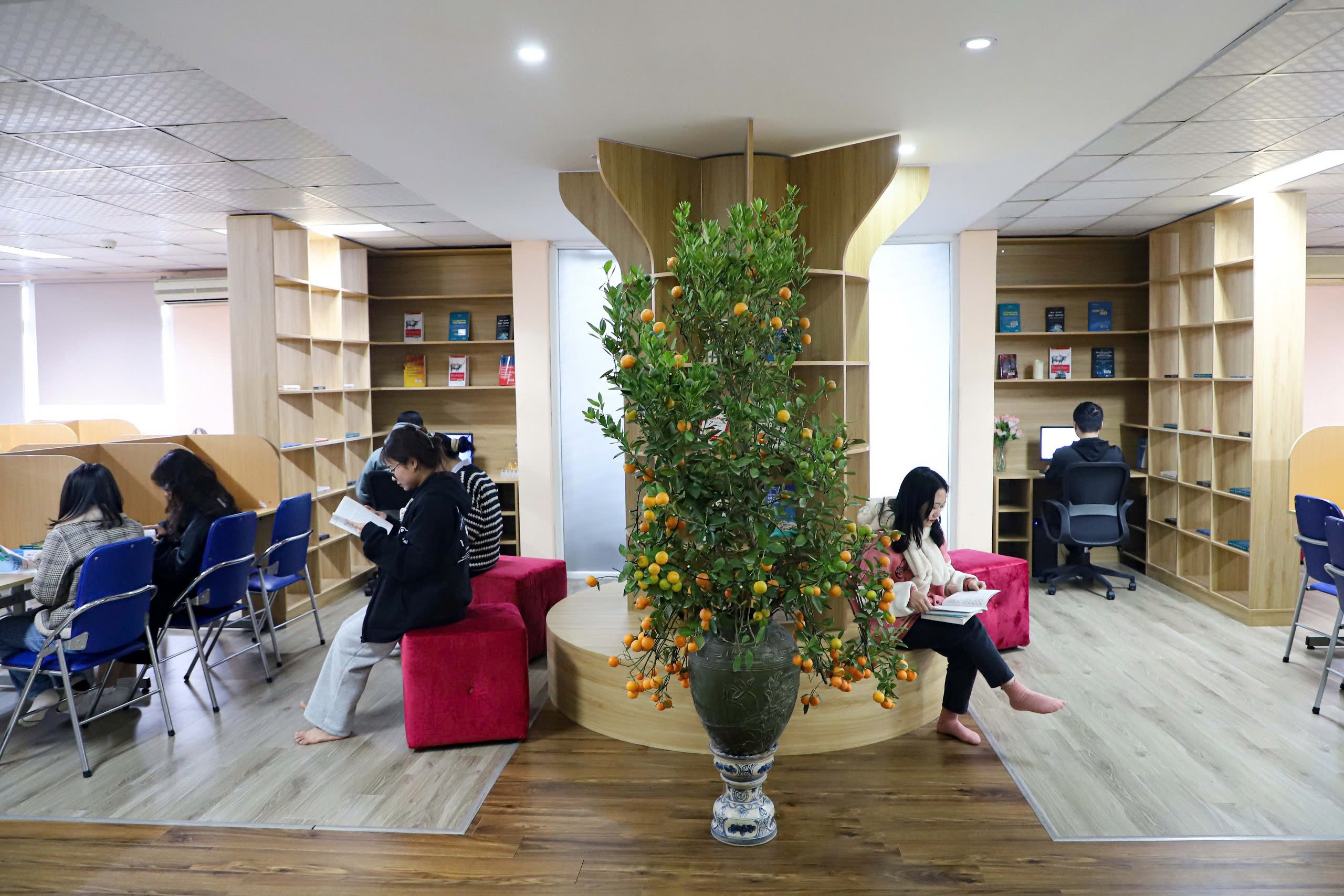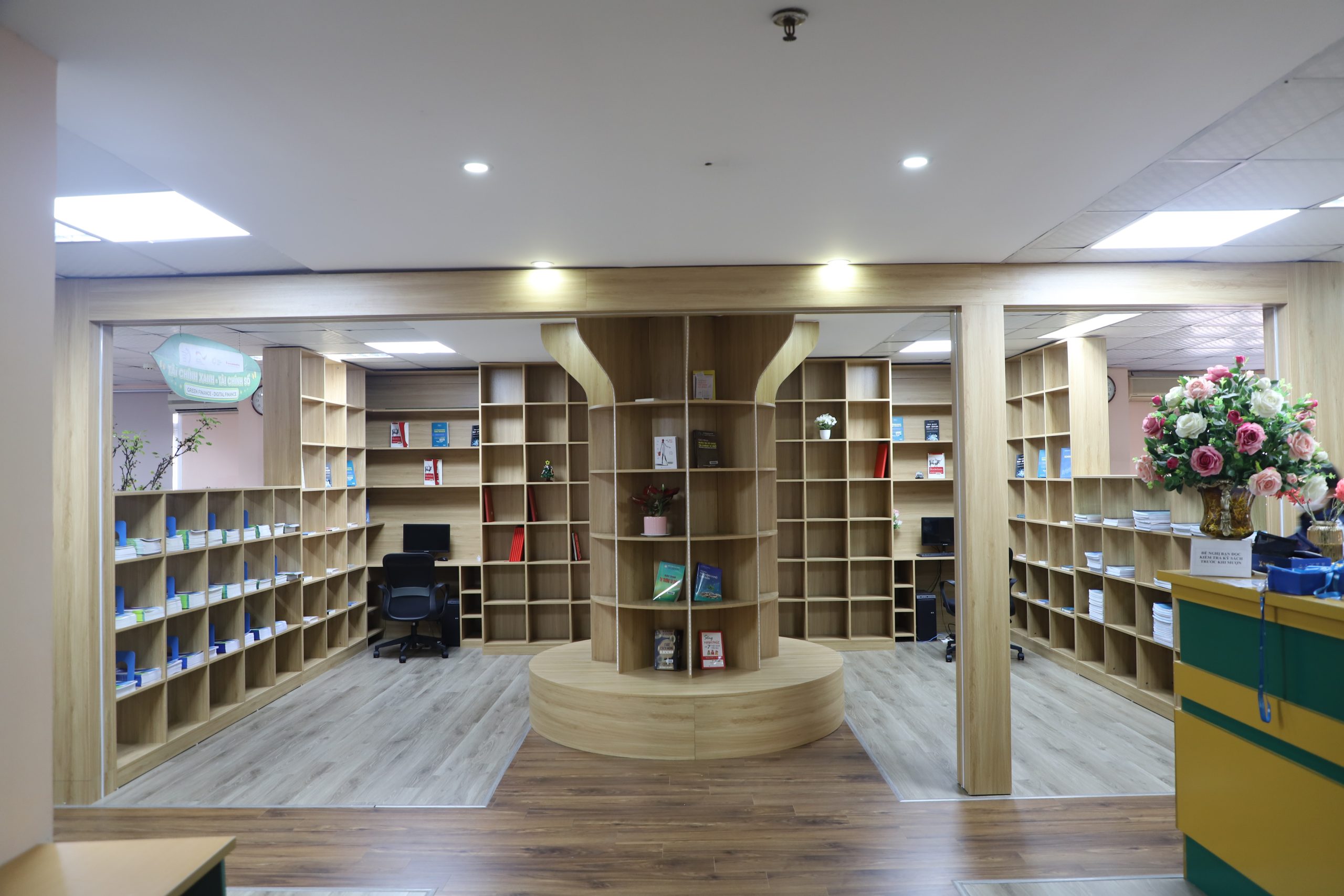 Các khu vực trong quầy sách được sắp xếp khoa học với bàn đọc, máy tính tra cứu, khu vực thảo luận nhóm và kệ tài liệu chuyên sâu. Đặc biệt, không gian trung tâm của quầy sách được bố trí kệ sách hình cây, vừa mang tính biểu tượng của tri thức, vừa tăng tính thẩm mỹ cho không gian học tập.