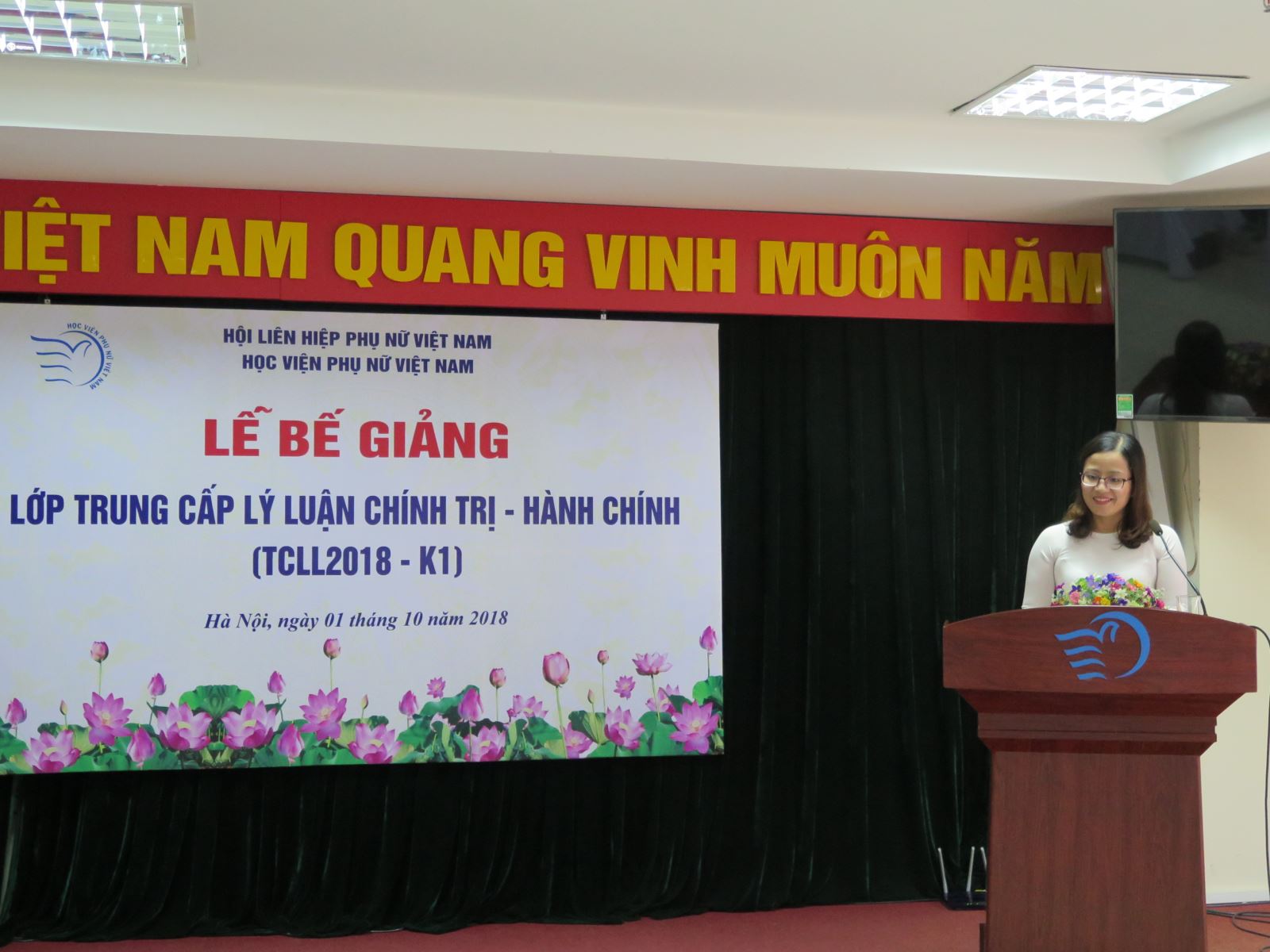 Tại buổi lễ, Ths. Vũ Thị Bích Đào – Giáo viên chủ nhiệm lớp đã báo cáo tổng kết tình hình học tập của lớp Trung cấp lý luận Chính trị – Hành chính khóa 1 năm 2018. Khóa học được tổ chức nhằm trang bị cho học viên những kiến thức cơ bản và cần thiết về lý luận chính trị – hành chính; củng cố, nâng cao bản lĩnh chính trị, phẩm chất đạo đức, trình độ lãnh đạo, quản lý; kỹ năng tổ chức thực hiện nhiệm vụ được Đảng, Nhà nước và nhân dân giao phó. Với đặc thù của lớp học có 100% học viên trình độ đại học và trên đại học, thuộc diện cán bộ quy hoạch của các đơn vị, tuổi đời trung bình là 41 tuổi. Bên cạnh những thuận lợi cơ bản là được lãnh đạo các đơn vị cử đi tạo điều kiện, giảng viên lớp học là những người có kinh nghiệm và thời gian học phù hợp với đặc thù thì cũng còn không ít khó khăn như phải vừa làm vừa học trong điều kiện nhiệm vụ được giao không được ảnh hưởng. Theo đó, kết thúc khóa học đã có 02 học viên đạt loại Giỏi chiếm tỷ lệ 3%; loại Khá: 65 học viên chiếm tỷ lệ: 97%.