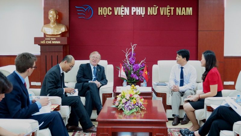 Trong quá trình trao đổi, ngài đại sứ cũng cho biết Việt Nam là một quốc gia thuộc diện ưu tiên trong Chiến lược Giáo dục Quốc tế của Canada và ông rất sẵn lòng kết nối để các tình nguyện viên Canada có thể trực tiếp tham gia vào các hoạt động tại Học viện Phụ nữ Việt Nam và ngược lại như mong muốn của Giám đốc Học viện.