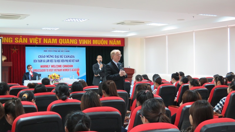 Ngài đại sứ thể hiện sự quan tâm sâu sắc đến các lĩnh vực đào tạo, bồi dưỡng, nghiên cứu của học viện và cho biết Canada thường xuyên tham gia và có tác động, đóng góp tích cực trong các sự kiện nhằm bảo vệ và thúc đẩy nhân quyền, trong đó có các quyền của người đồng tính, song tính và chuyển giới (LGBTI) và các quyền của phụ nữ, là ưu tiên quan trọng trong chính sách đối ngoại của Canada. Ngài cho biết: “Chúng tôi tin tưởng rằng bình đẳng giới đóng vai trò thiết yếu đối với phát triển bền vững, công bằng xã hội, hòa bình và an ninh”.