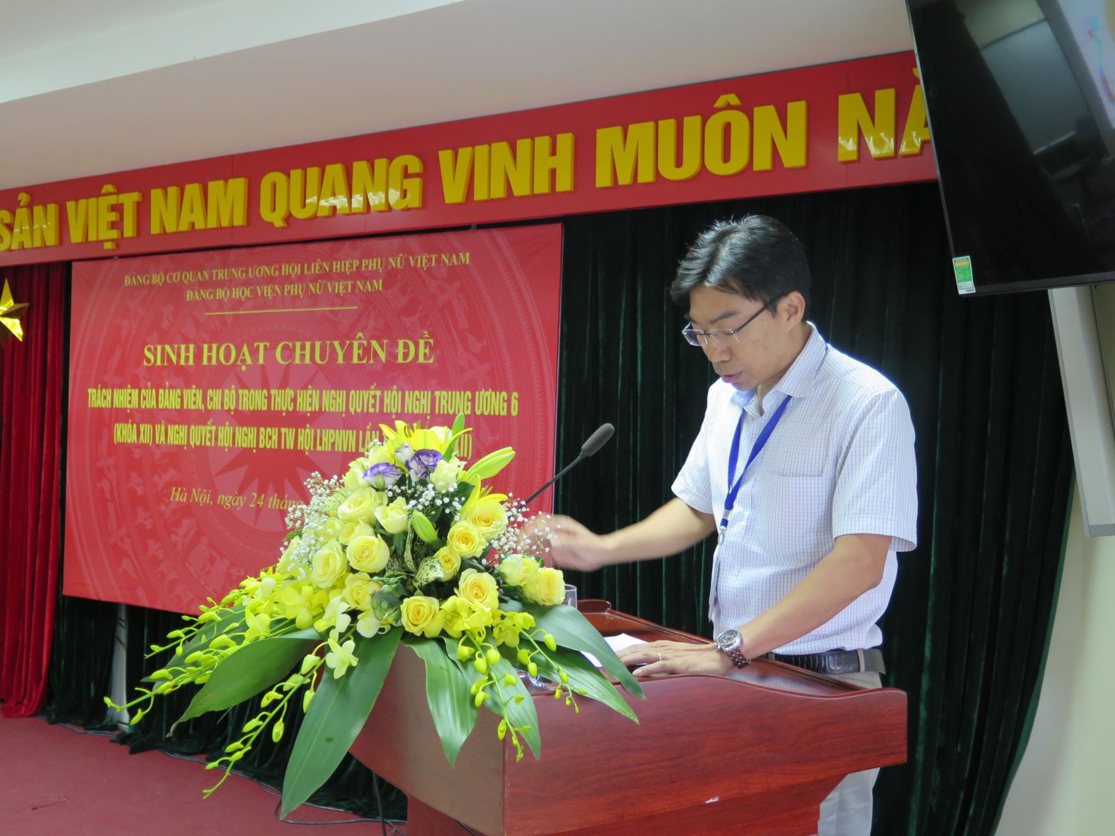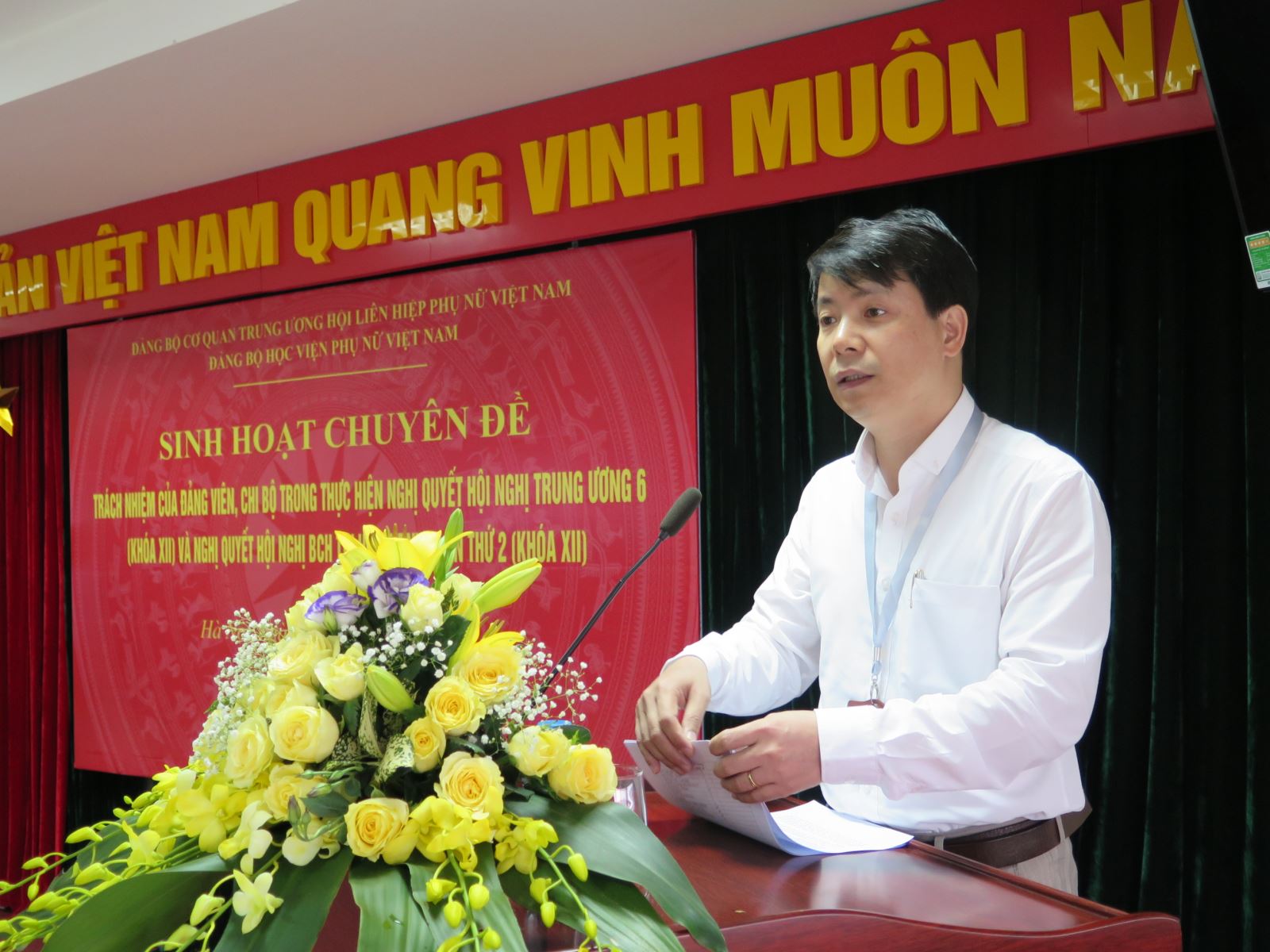 TS. Trần Quang Tiến, Bí thư Đảng ủy Học viện chủ trì hội nghị đã phát biểu đề dẫn nêu rõ mục đích, ý nghĩa của hội nghị, mong muốn và hy vọng thông qua các tham luận sẽ giúp đảng viên, quần chúng hiểu sâu sắc hơn về 04 Nghị quyết Hội nghị Ban Chấp hành TW Đảng lần thứ 6 và 01 Nghị quyết Ban Chấp hành Hội Liên hiệp Phụ nữ Việt Nam, đặc biệt là Nghị quyết số 19 -NQ/TW về tiếp tục đổi mới hệ thống tổ chức và quản lý, nâng cao chất lượng và hiệu quả hoạt động của các đơn vị sự nghiệp công lập có liên quan trực tiếp đến Học viện.