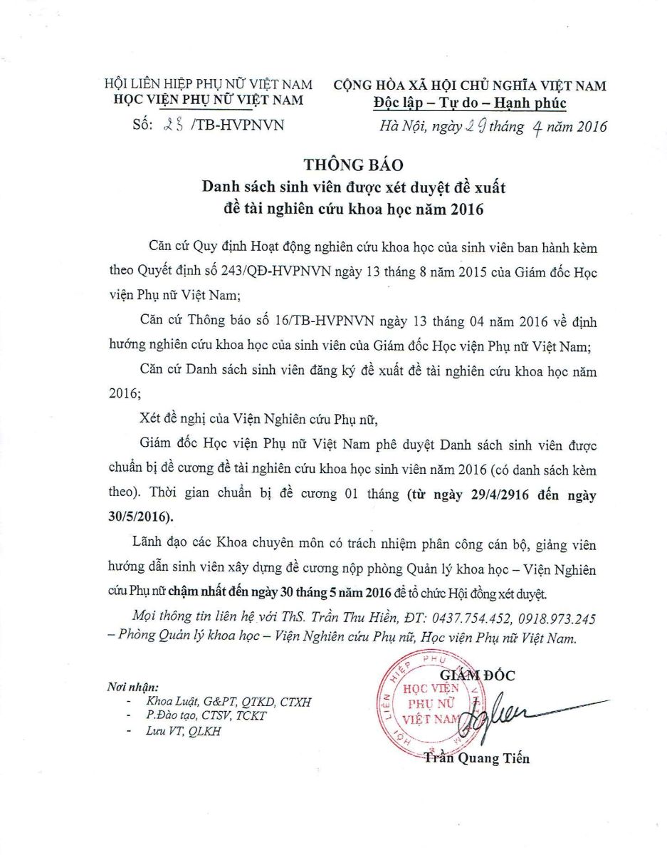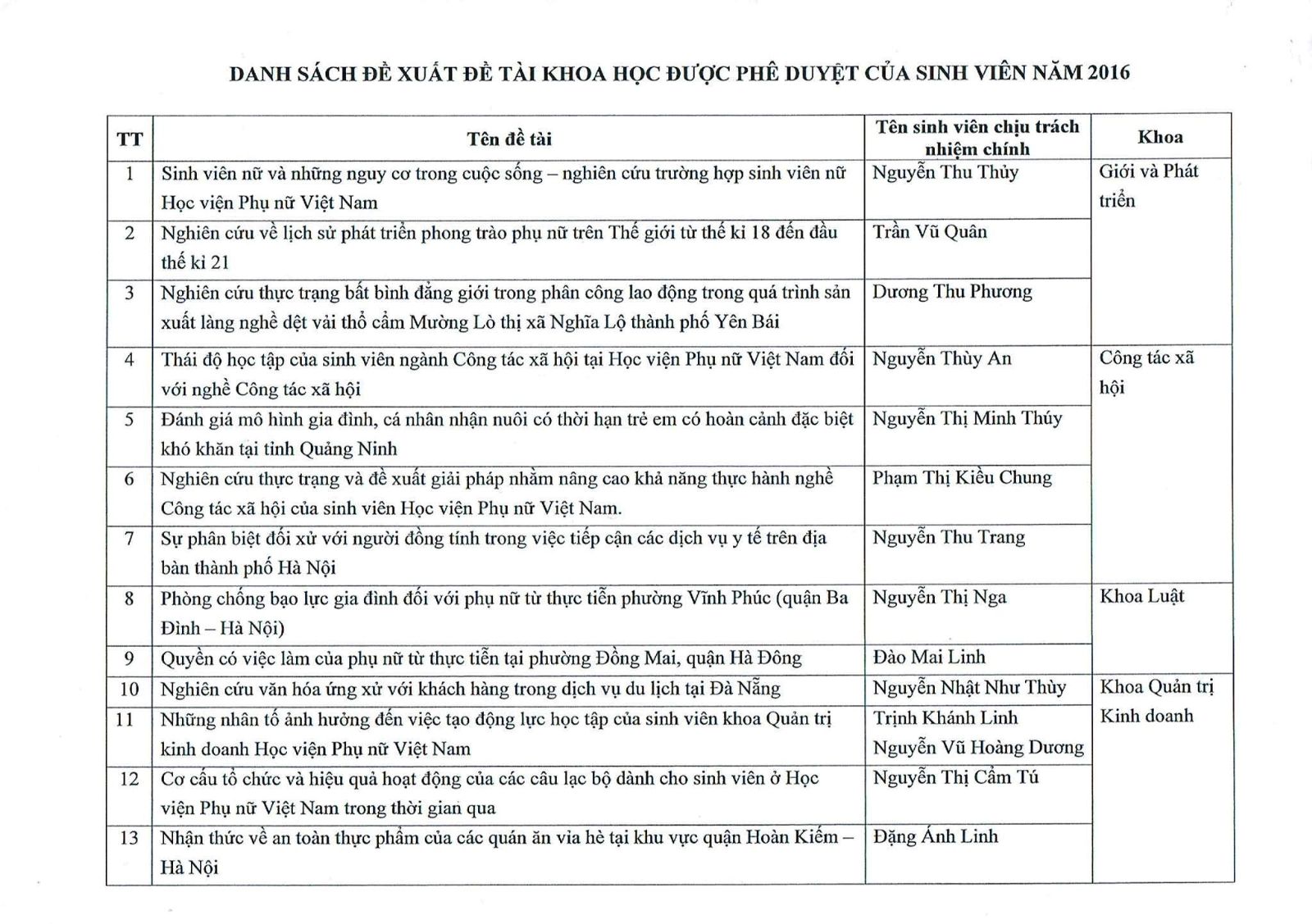 Danh sách sinh viên được xét duyệt đề xuất đề tài NCKH