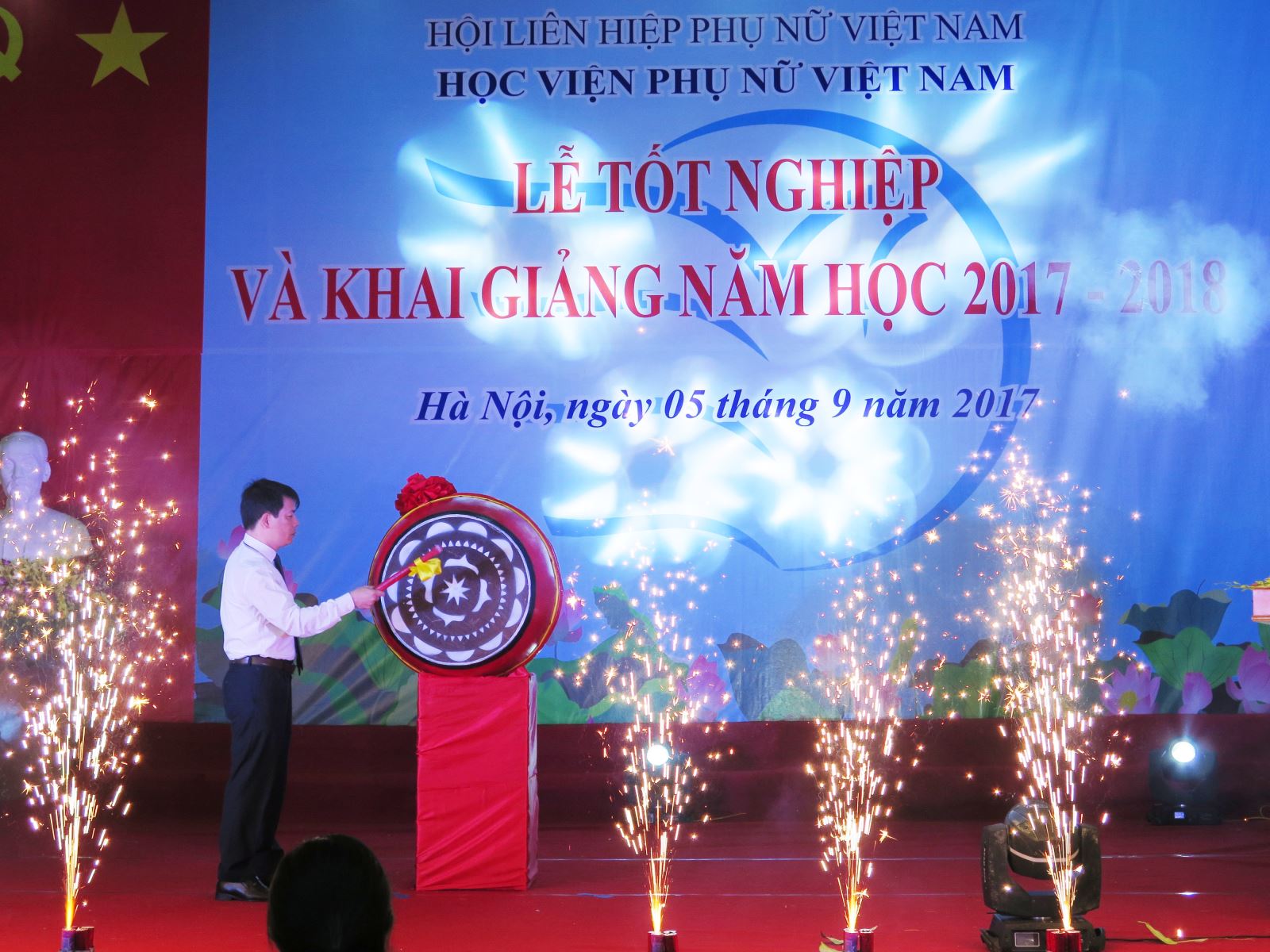 Trong không khí trang nghiêm và phấn khởi của buổi lễ, thay mặt Ban Giám đốc Học viện Phụ nữ Việt Nam tôi xin tuyên bố khai giảng năm học mới 2017-2018.