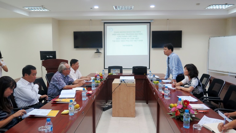 TS. Trần Quang Tiến – Giám đốc Học viện Phụ nữ Việt Nam và lãnh đạo các khoa, phòng thuộc học viện đã đón tiếp PGS TS Trần Xuân Nhĩ – Phó chủ tịch Hiệp hội, nguyên thứ trưởng Bộ GD&ĐT cùng các thành viên của đoàn.