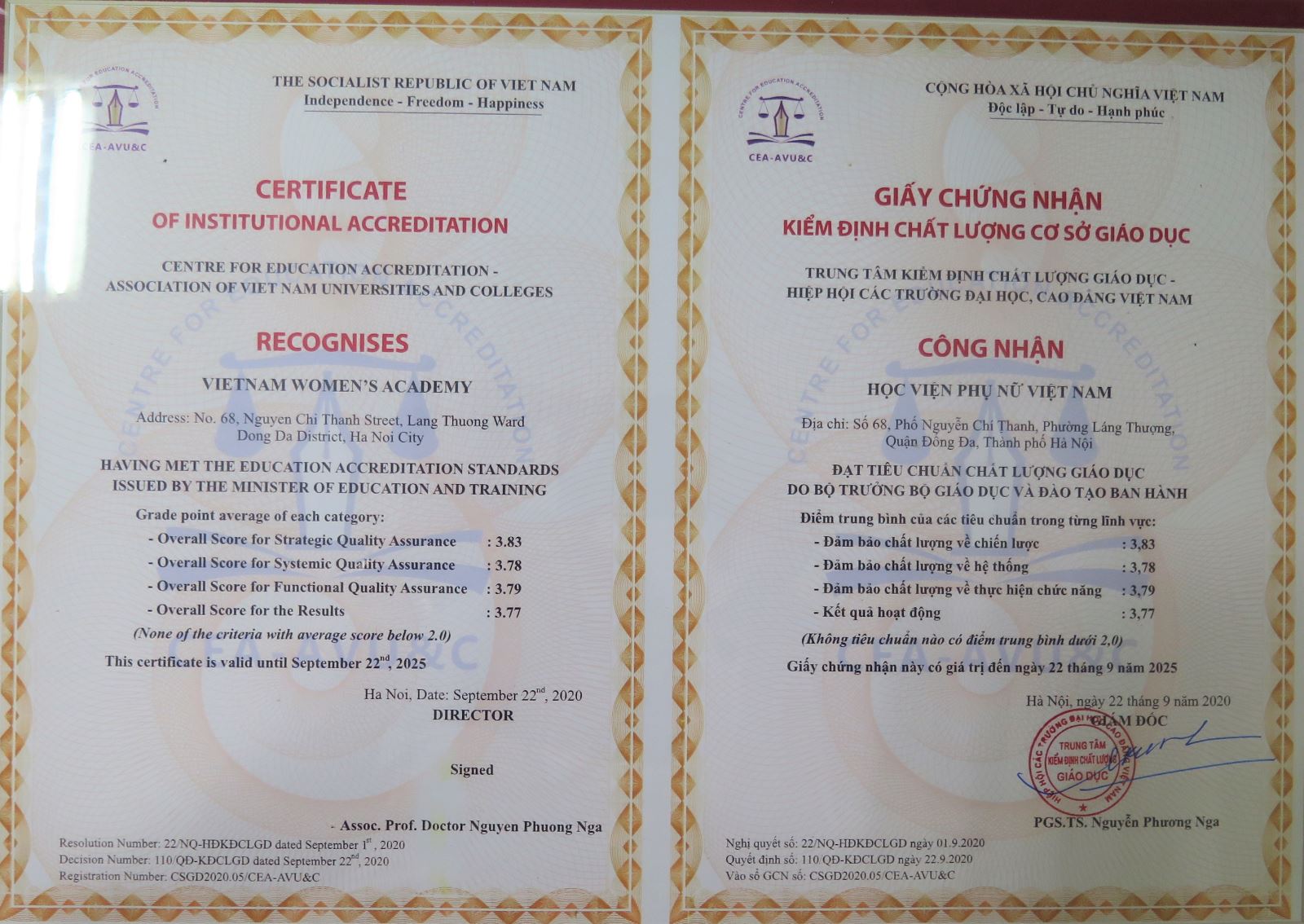 Học viện Phụ nữ Việt Nam nhận Giấy chứng nhận đạt tiêu chuẩn kiểm định chất lượng theo bộ tiêu chí đánh giá mới của Bộ Giáo dục và Đào tạo.