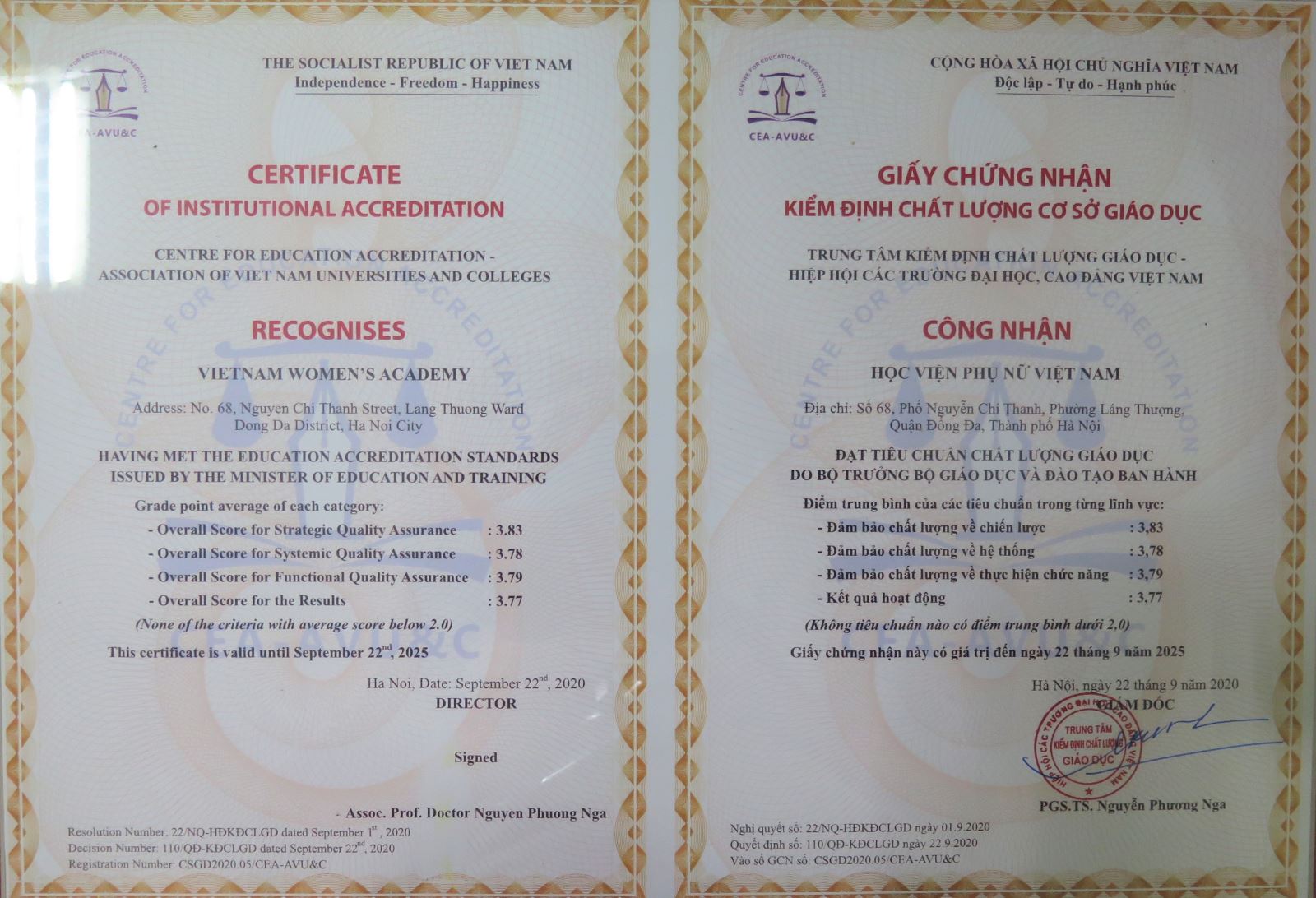 Sau 60 năm thực hiện công tác đào tạo, bồi dưỡng cán bộ Hội, cán bộ nữ, nghiên cứu các vấn đề về công tác phụ nữ, bình đẳng giới; Sau 8 năm đào tạo nguồn nhân lực trình độ đại học và sau đại học, tháng 9/2020 Học viện Phụ nữ Việt Nam chính thức xuất hiện trong danh sách khoảng 30 CSGD đại học đầu tiên của Việt Nam đạt chuẩn chất lượng giáo dục quốc gia theo các tiêu chí tiếp cận Bộ tiêu chuẩn của Mạng lưới các trường đại học Đông Nam Á (AUN).