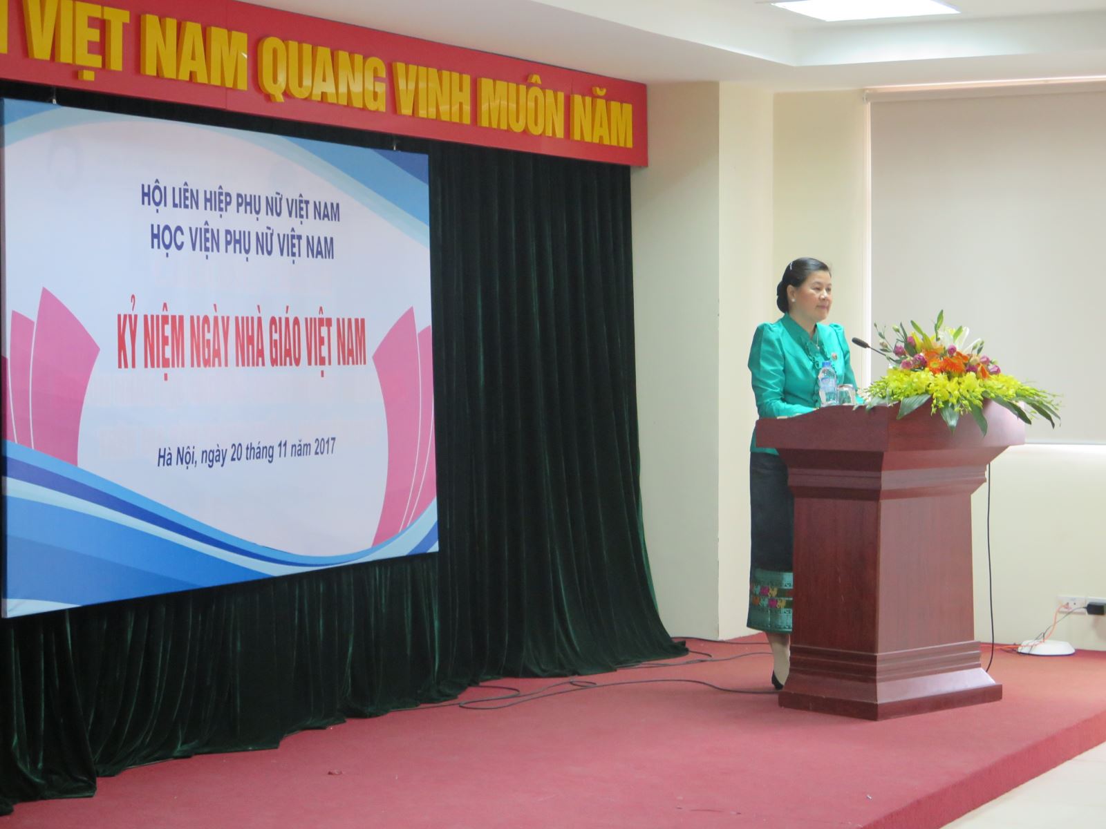 Ngay sau những tiết mục văn nghệ chào mừng của các em sinh viên, các chị cán bộ Hội Liên hiệp Phụ nữ Lào và giảng viên, viên chức Học viện, TS. Trần Quang Tiến đã đọc diễn văn ôn lại lịch sử ra đời của ngày hiến chương các nhà giáo quốc tế và Việt Nam. Đồng chí cũng đã nhấn mạnh: Hoạt động kỷ niệm ngày nhà giáo Việt Nam được tổ chức trong bối cảnh kinh tế – xã hội ở Việt Nam và thế giới có những biến đổi nhanh chóng và tác động sâu sắc đến tư tưởng, hành động của tất cả mọi người, trong đó có các thầy cô giáo và sinh viên Học viện, nhưng thầy và trò Học viện vẫn đạt được những kết quả rất tích cực, trên tất cả các mặt công tác trong năm học 2016-2017 và học kỳ I năm học 2017-2018. Thay mặt Ban Giám đốc, TS. Trần Quang Tiến mong muốn các thầy, cô giáo của Học viện luôn giữ được niềm đam mê, luôn cảm thấy hạnh phúc khi được giảng dạy; đồng thời cũng đề nghị các thầy, cô sẽ nỗ lực cùng với đội ngũ quản lý, viên chức và người lao động để đưa Học viện ngày càng phát triển, tạo ra một môi trường làm việc để mọi người đều cảm thấy hạnh phúc khi đến làm việc, học tập tại đây.