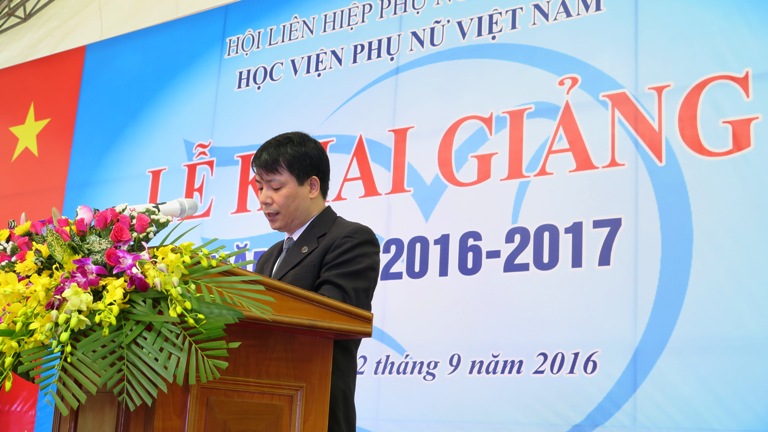 Sau phần chào cờ, TS. Trần Quang Tiến – Giám đốc Học viện Phụ nữ Việt Nam đã phát biểu khai mạc lễ khai giảng năm học 2016 – 2017. Giám đốc gửi đến các đồng chí lãnh đạo, các vị khách quý đại diện Trung ương Hội, các Bộ, ban, ngành, các trường đại học lời chào mừng nồng nhiệt. Thay mặt Học viện, TS. Trần Quang Tiến cũng gửi lời chúc mừng đến 594 tân sinh viên, những người đã chọn Học viện là nơi rèn đức luyện tài vì ngày mai lập nghiệp.