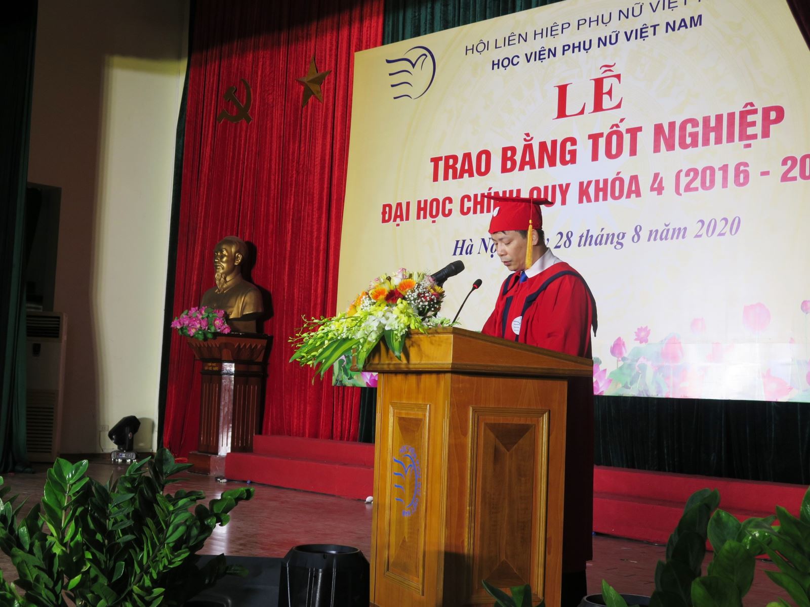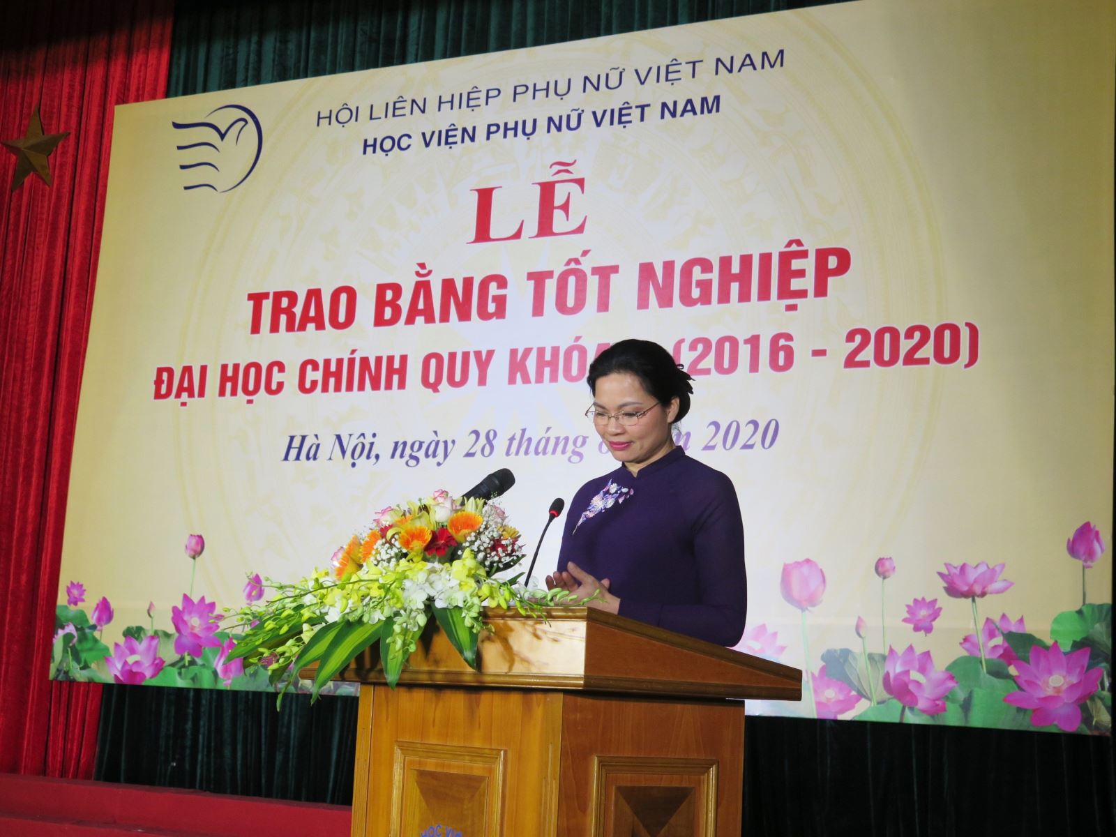 Phát biểu tại lễ trao bằng cử nhân của Học viện, đồng chí Hà Thị Nga – Chủ tịch Hội (LHPN) Việt Nam đã ghi nhận chặng đường rèn luyện, học tập, phấn đấu của sinh viên, sự cố gắng, nỗ lực không mệt mỏi của tập thể cán bộ, giảng viên Học viện Phụ nữ Việt Nam. Chủ tịch Hà Thị Nga cũng mong muốn Học viện Phụ nữ Việt Nam tiếp tục quan tâm, phát hiện, bồi dưỡng, kết nạp Đảng cho sinh viên, chủ động ứng dụng công nghệ vào hoạt động giảng dạy, tích cực đổi mới phương pháp giáo dục, lấy người học làm trung tâm… Học viện cần nỗ lực để từng bước khẳng định vị trí, thương hiệu của học viện trong hệ thống các cơ sở giáo dục đại học của cả nước. Đồng chí cũng gửi gắm những lời tâm huyết tới các tân cử nhân Học viện Phụ nữ Việt Nam: “Các em hãy tự tin với hành trang, kiến thức, kỹ năng mình có được. Các em hãy luôn tự hào là cựu sinh viên Học viện Phụ nữ Việt Nam, mái trường với lịch sử 60 năm truyền thống vẻ vang. Đất nước còn nhiều khó khăn, nhiều vấn đề xã hội, vấn đề giới, vấn đề phát triển liên quan đến các lĩnh vực cần giải quyết. Các em hãy tiếp tục phát huy trách nhiệm công dân, sự sáng tạo để phát triển sự nghiệp của bản thân và có những đóng góp thiết thực cho xã hội”.