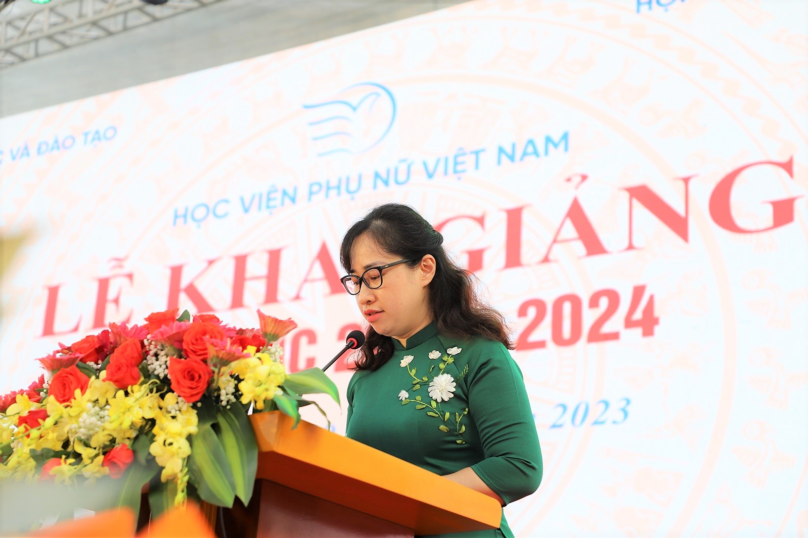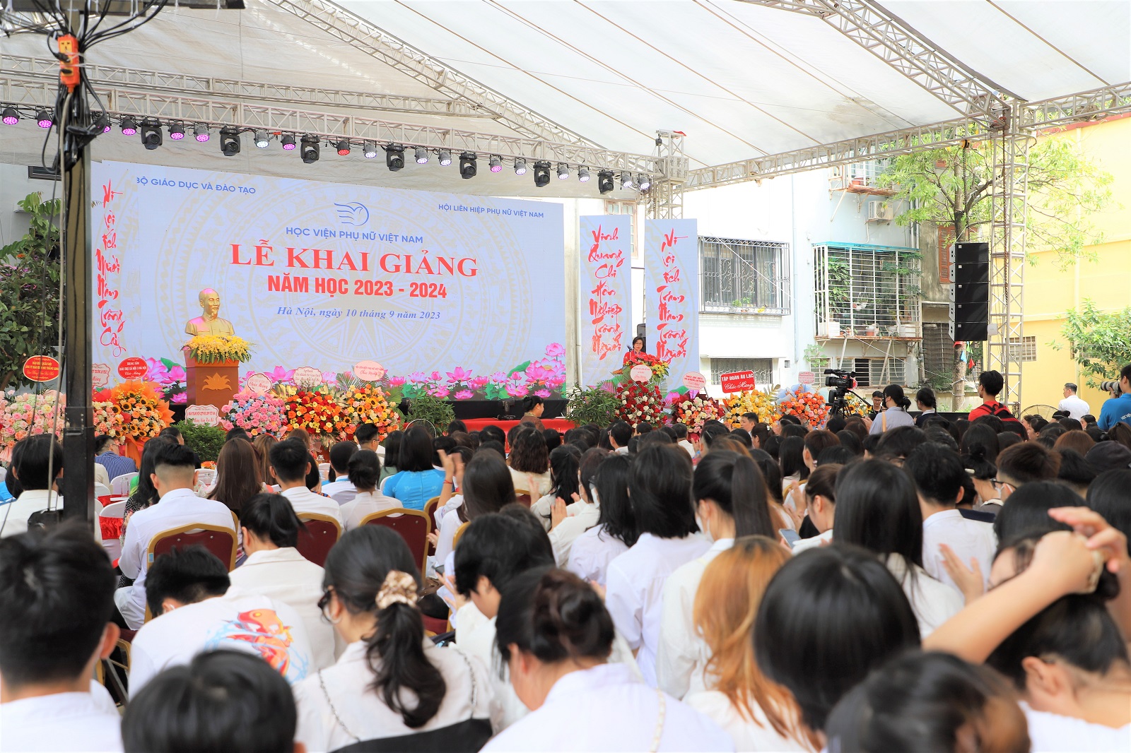 Phát biểu tại lễ Khai giảng, Phó chủ tịch Hội LHPN Việt Nam Tôn Ngọc Hạnh đánh giá cao những nỗ lực và kết quả đã đạt được về đào tạo, bồi dưỡng, nghiên cứu khoa học… của Học viện Phụ nữ Việt Nam năm học 2023-2024. Để Học viện Phụ nữ Việt Nam thực hiện tốt chủ đề năm học ‘Đoàn kết, kỷ cương, sáng tạo, tiếp tục đổi mới, nâng cao chất lượng giáo dục và đào tạo’, Phó chủ tịch Hội LHPN Việt Nam Tôn Ngọc Hạnh nhấn mạnh những vấn đề sau: Một là, đối với Ban Giám đốc Học viên, tiếp tục chỉ đạo, hướng dẫn, tổ chức thực hiện có hiệu quả các nhiệm vụ trọng tâm về: Nâng cao năng lực đội ngũ viên chức, người lao động; Đổi mới phương pháp bồi dưỡng sát thực tiễn, thay đổi cách đánh giá kết quả học tập của học viên từ bản thu hoạch thành kế hoạch vận dụng kiến thức, kỹ năng theo các nhóm chủ đề học tập để tránh việc học mang tính hình thức…; Hai là, đối với thầy cô giáo, cần tiếp tục phát huy điểm mạnh, luôn đổi mới, sáng tạo, thực hiện lồng ghép giới trong giảng dạy, truyền cảm hứng nghiên cứu, học tập cho sinh viên, tạo động lực và điều kiện để sinh viên thể hiện năng lực thực tế trong học tập…; Ba là, đối với sinh viên, cần chủ động trong học tập chuyên ngành, tự tin trao đổi, tự tìm tòi, học hỏi, nắm chắc kiến thức, hiểu sâu kỹ năng, xây dựng năng lực xử lý hiệu quả các tình huống, các vấn đề dựa vào tinh thần tự học có hướng dẫn, tích cực trao đổi, cập nhật thông tin và học từ thực tiễn thông qua nghiên cứu khoa học, tăng cường năng lực thực hành… Đồng thời, chú trọng rèn luyện đạo đức, lối sống, lý tưởng của đoàn viên, thanh niên thời kỳ mới ‘Tâm trong. Trí sáng. Hoài bão lớn’. Ngoài ra, các em cũng cần chú ý việc học ngoại ngữ, tin học để bảo đảm tốt nghiệp đúng hạn.