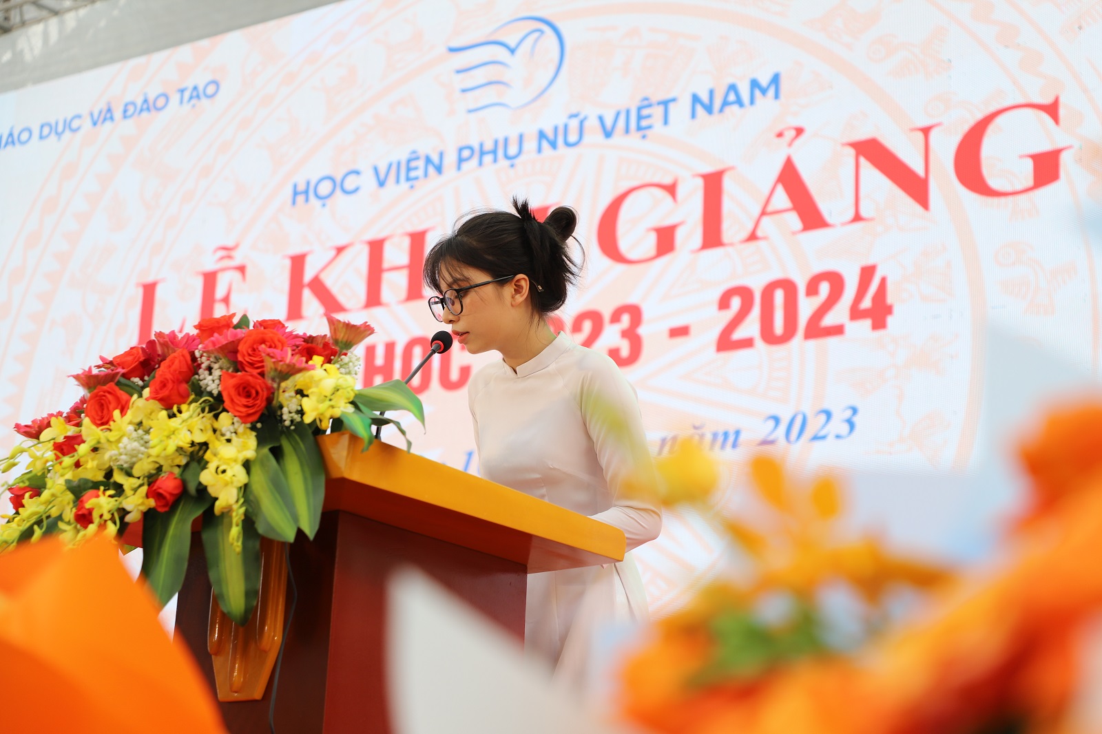 Thay mặt hơn 1.500 tân sinh viên của Học viện, sinh viên khoa Truyền thông đa phương tiện Nguyễn Khánh Ly chia sẻ niềm vui, sự xúc động khi có mặt tại Học viện trong lễ khai giảng sau một hành trình dài tìm hiểu và lựa chọn: Giây phút này em đã trở thành một tân sinh viên của Học viện Phụ nữ Việt Nam, đây không chỉ là niềm vui, sự tự hào của riêng em mà em nghĩ đó là niềm vui chung của tất cả các bạn tân sinh viên ngồi đây. Cánh cửa đại học mở ra với biết bao thách thức do thay đổi môi trường sống, phương pháp và nội dung học tập. Tuy nhiên, điều đó sẽ làm lòng quyết tâm, ý thức tự lập, chủ động của mỗi bạn tân sinh viên trở nên mạnh mẽ hơn bao giờ hết. Đặc biệt, chúng em có sự hướng dẫn của những thầy cô tận tâm, nhiệt thành với nghề, có sự đồng hành của các anh chị khóa trên và những người bạn mới trong hành trình khám phá thế giới tri thức và khoa học, để từng ngày trôi qua chúng em sẽ tìm thấy những giá trị tốt đẹp của cuộc sống và hoàn thiện bản thân trở nên tốt đẹp hơn mỗi ngày. Chúng em xin hứa sẽ phấn đấu hết mình trong học tập, rèn luyện, tiếp nối và phát huy mạnh mẽ thành công đã đạt được của thế hệ sinh viên đi trước để góp phần tô điểm trang sử của Học viện.