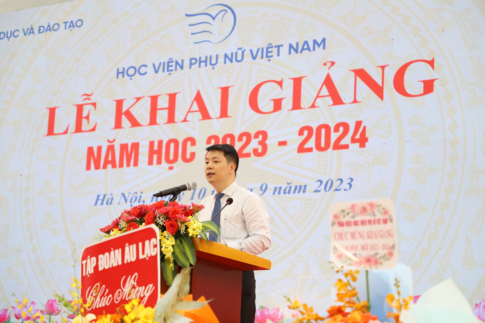 Phát biểu tại lễ Khai giảng, PGS.TS. Trần Quang Tiến – Bí thư Đảng ủy, Giám đốc Học viện nồng nhiệt chúc mừng và chào đón hơn 1500 tân sinh viên khóa 11 của Học viện Phụ nữ Việt Nam và 15 học viên là các cán bộ lãnh đạo cấp vụ đến từ TW Hội LHPN Lào và 10 bộ ngành của nước Cộng hòa dân chủ nhân dân Lào tham gia lớp bồi dưỡng 2 tháng tại Học viện. Giám đốc Học viện nêu bật những dấu ấn, thành tựu quan trọng của Năm học 2022 – 2023: Học viện đã phát huy tốt các kết quả, giá trị đạt được của 10 năm đầu tiên thành lập Học viện và hơn 60 năm truyền thống vẻ vang của nhà trường. Kết quả nổi bật nhất đến từ việc Học viện nhanh chóng chuyển đổi sang “trạng thái bình thường mới” sau đại dịch COVID-19, gắn với tiếp tục duy trì ở tiêu chuẩn cao phương thức giảng dạy, mô hình học tập kết hợp (blended learning) ở tất cả các lớp học và đẩy mạnh xây dựng hệ thống CNTT đáp ứng yêu cầu chuyển đổi số một cách toàn diện, triệt để.