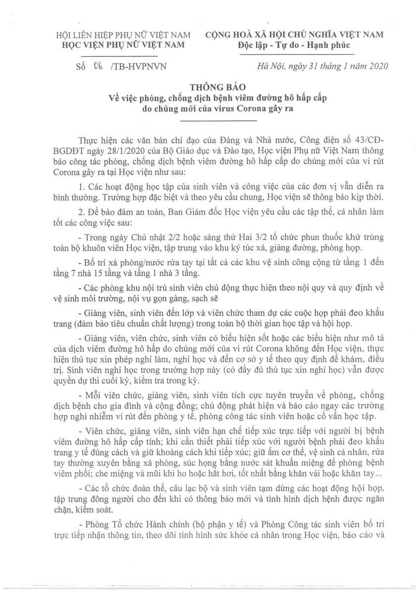 HVPNVN THÔNG BÁO PHÒNG CHỐNG DỊCH BỆNH DO VIRUS CORONA GÂY RA