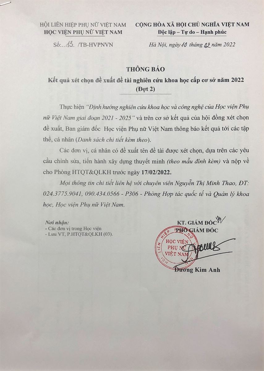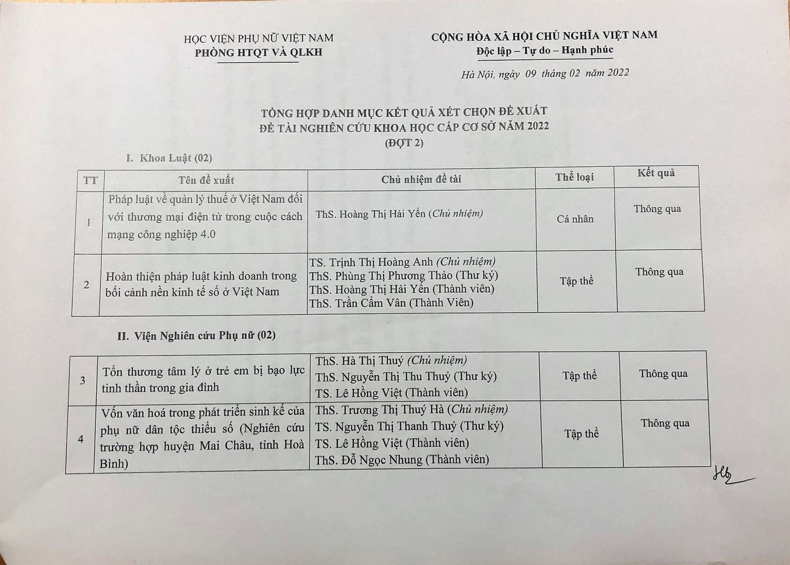 Kết quả xét chọn đề tài NCKH cấp cơ sở (đợt 2)