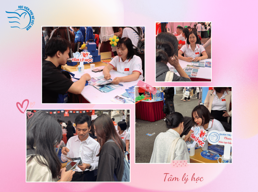 Đội ngũ giảng viên cùng sinh viên Học viện Phụ nữ Việt Nam đã tận tình tư vấn, giải đáp thắc mắc, đồng thời giới thiệu những điểm nổi bật của chương trình đào tạo. Với định hướng kết hợp hài hòa giữa nền tảng lý thuyết vững chắc và tăng cường trải nghiệm thực hành, ngành Tâm lý học mang đến cho người học sự chuẩn bị toàn diện, đáp ứng tốt yêu cầu của thị trường lao động hiện nay.