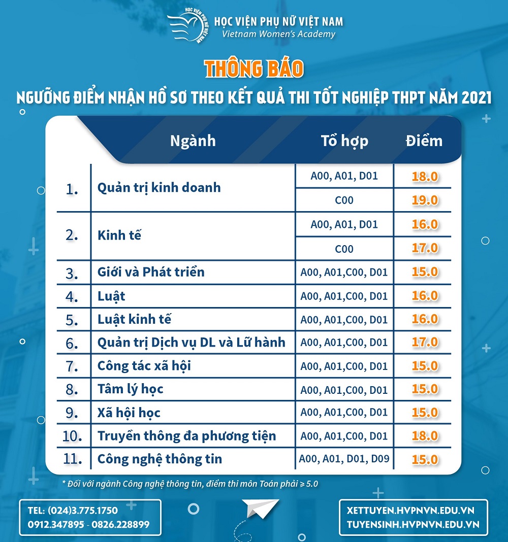 Căn cứ vào ngưỡng điểm nhận hồ sơ xét tuyển đã công bố và theo quy định của Bộ GD & ĐT, từ ngày 29/8 đến 17h ngày 05/9/2021, thí sinh có nguyện vọng đăng ký xét tuyển vào Học viện Phụ nữ Việt Nam bằng hình thức xét điểm thi có thể thực hiện điều chỉnh nguyện vọng (ưu tiên đăng ký NV1) tại địa chỉ website: http://thisinh.thithptquocgia.edu.vn/.