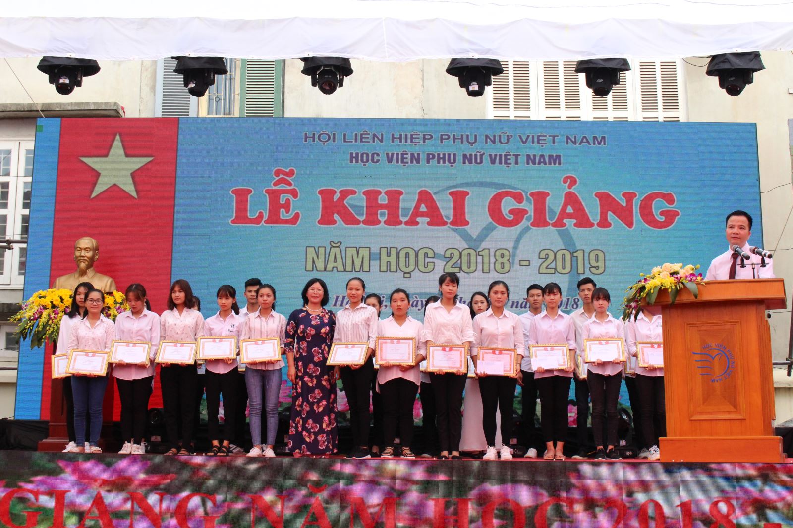 Phó Giám đốc học viện Hà Thị Thanh Vân trao học bổng và tặng hoa chúc mừng các tân sinh viên đạt điểm cao trong kỳ thi tốt nghiệp PTTH Quốc gia