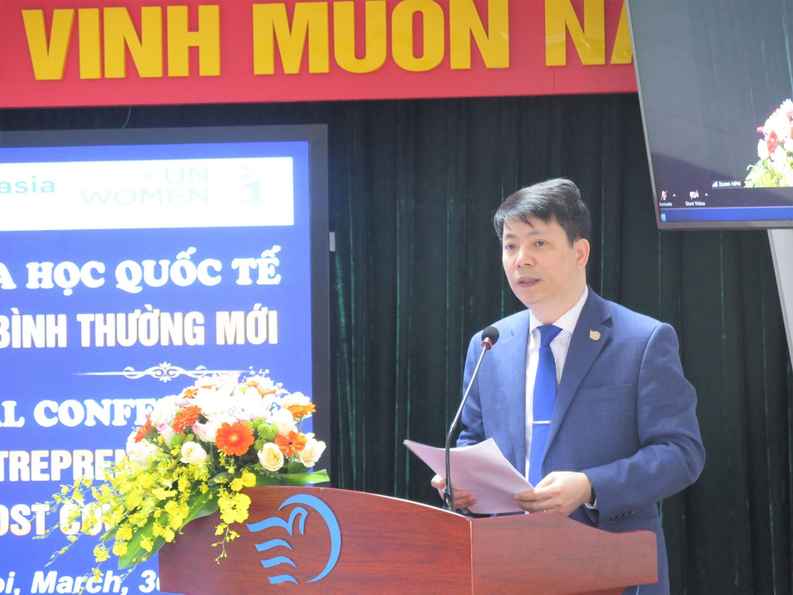 Phát biểu đề dẫn, PGS.TS Trần Quang Tiến – Giám đốc Học viện Phụ nữ Việt Nam – thông tin: Theo số liệu thống kê, các doanh nghiệp do phụ nữ làm chủ chiếm 26,5% tổng số doanh nghiệp Việt Nam, cứ 4 doanh nghiệp tư nhân của Việt Nam có 1 doanh nghiệp do phụ nữ lãnh đạo. Nữ giới đóng góp tới 40% của cải của nền kinh tế Việt Nam. Tuy nhiên, thực tế phụ nữ Việt Nam còn gặp nhiều rào cản, thách thức trong phát triển bản thân, nhưng lại rất có lợi thế trong đổi mới sáng tạo, khởi nghiệp. Ở khía cạnh khác, chúng ta nhìn nhận vai trò của các lãnh đạo nữ trong chèo lái con thuyền doanh nghiệp của mình đương đầu với đại dịch, duy trì đà tăng trưởng hoặc khởi nghiệp trong giai đoạn thách thức này. Không chỉ kinh doanh thành công, các doanh nghiệp và start-up do phụ nữ lãnh đạo còn rất quan tâm đến việc chung tay giải quyết các thách thức xã hội do Covid-19 gây ra.