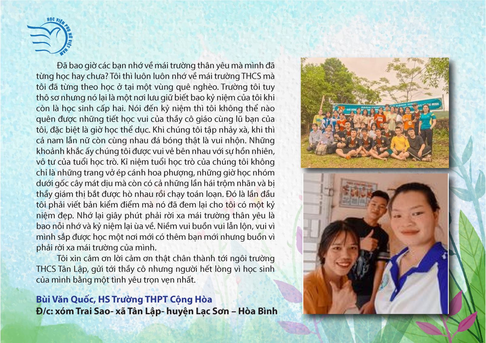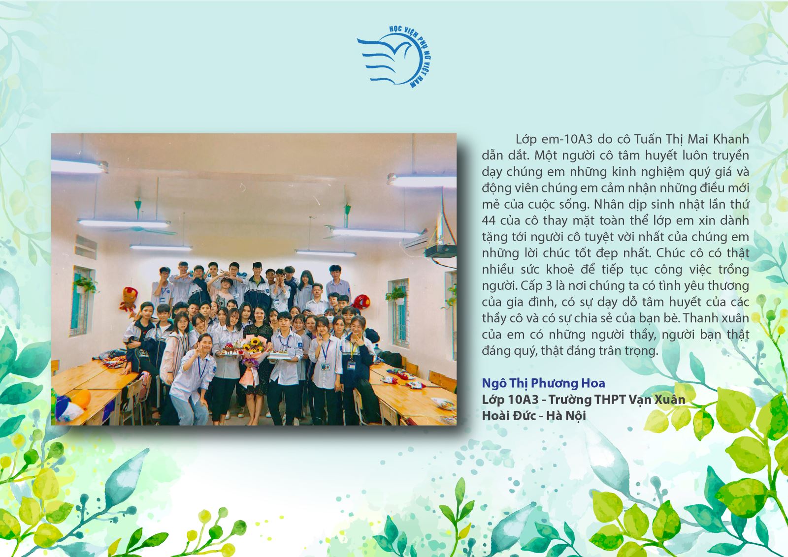 Ngô Thị Phương Hoa, lớp 10A3 – Trường THPT Vạn Xuân, Hoài Đức, Hà Nội