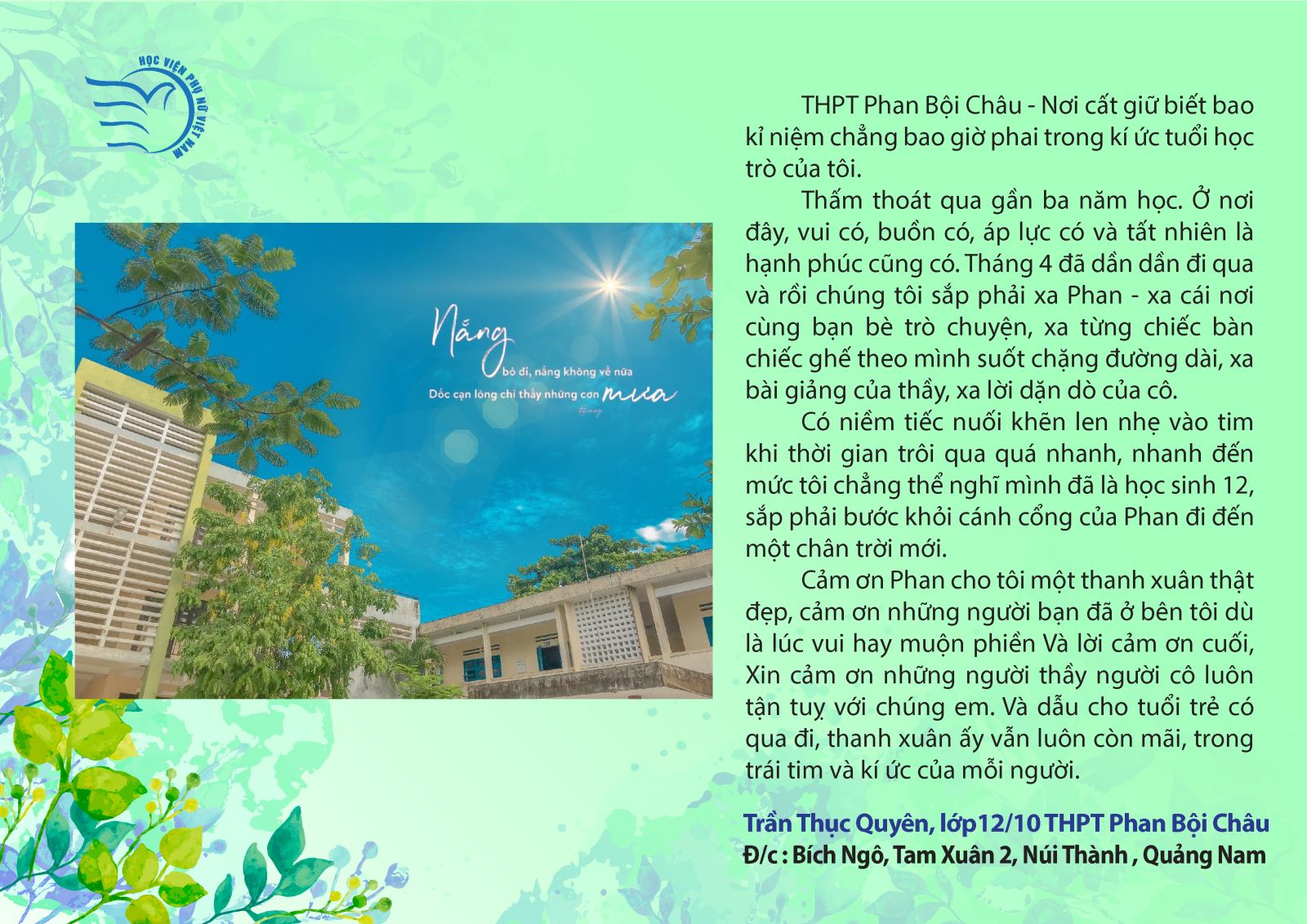 Trần Thục Quyên, lớp 12/10 THPT Phan Bội Châu, Tp. Tam Kỳ, Quảng Nam