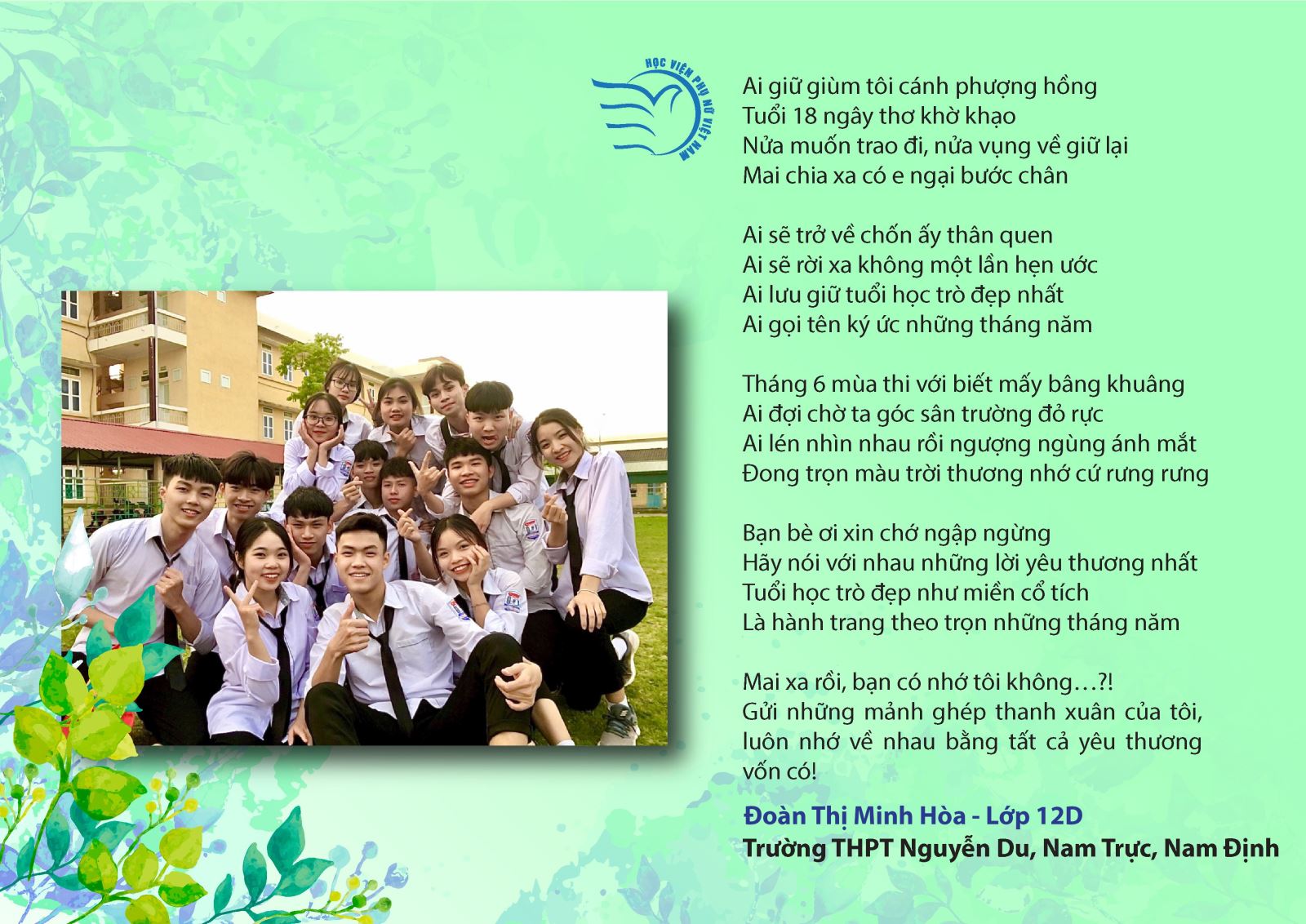 Giải NỘI DUNG ấn tượng: Đoàn Thị Minh Hòa – Lớp 12D, Trường THPT Nguyễn Du, Nam Trực, Nam Định