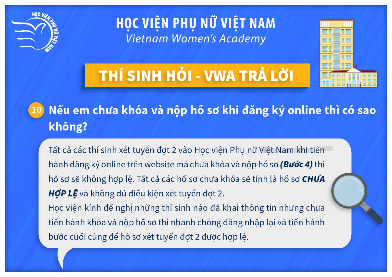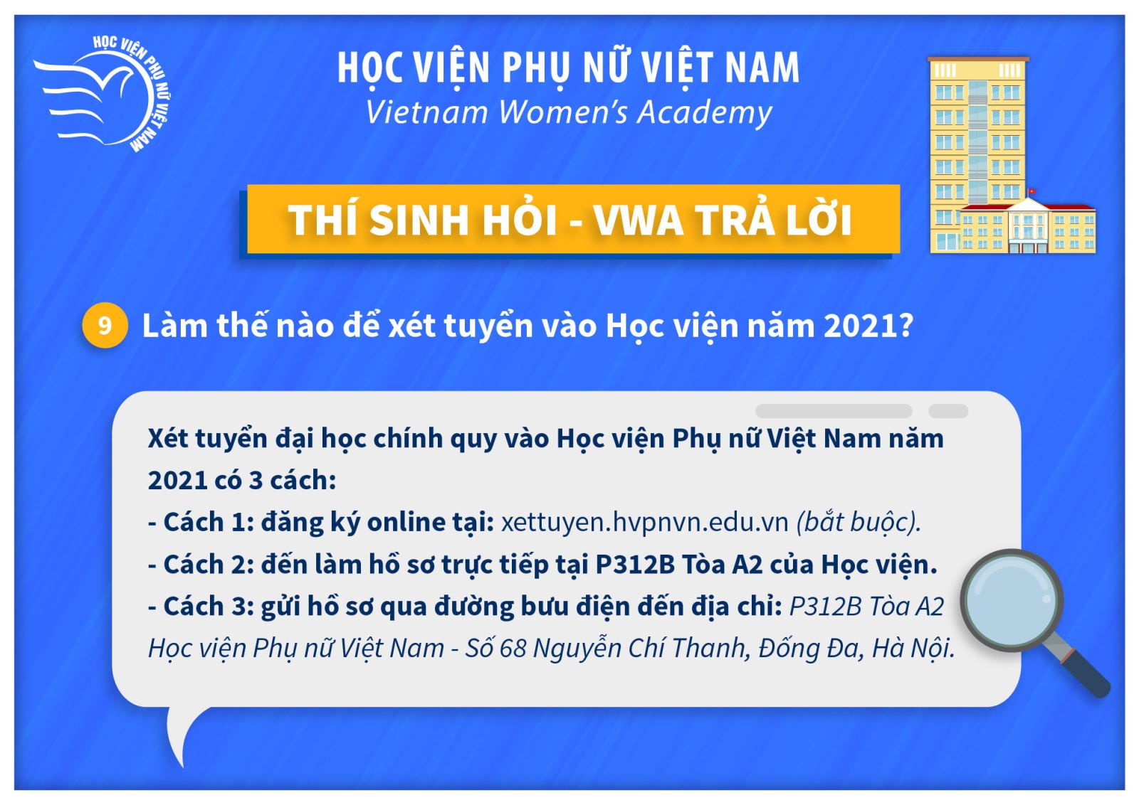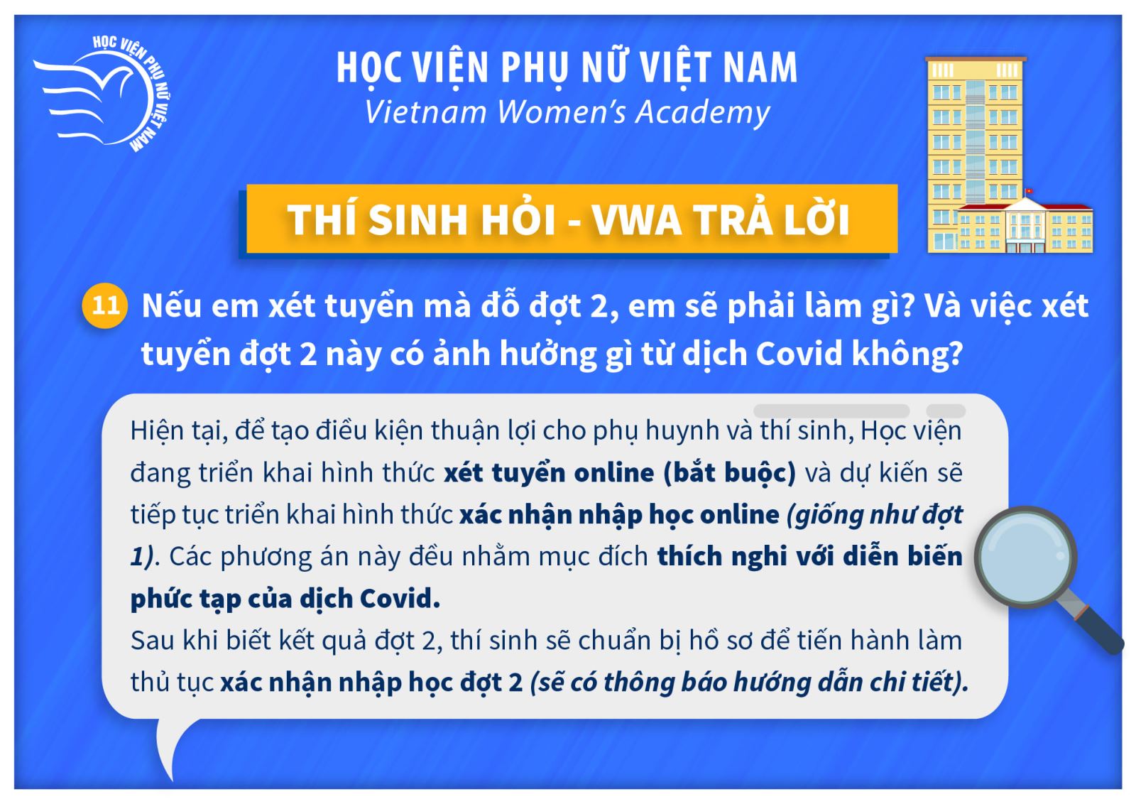 Tin tứcThí sinh hỏi – VWA trả lời (P2) Posted on Tháng Bảy 11, 2021 by admin(full) 11 Th7 admin(full) Lưu ý mốc thời gian tuyển sinh quan trọng năm 2021 Thông báo thi chuẩn đầu ra Tiếng Anh đợt 3 năm học 2020-2021