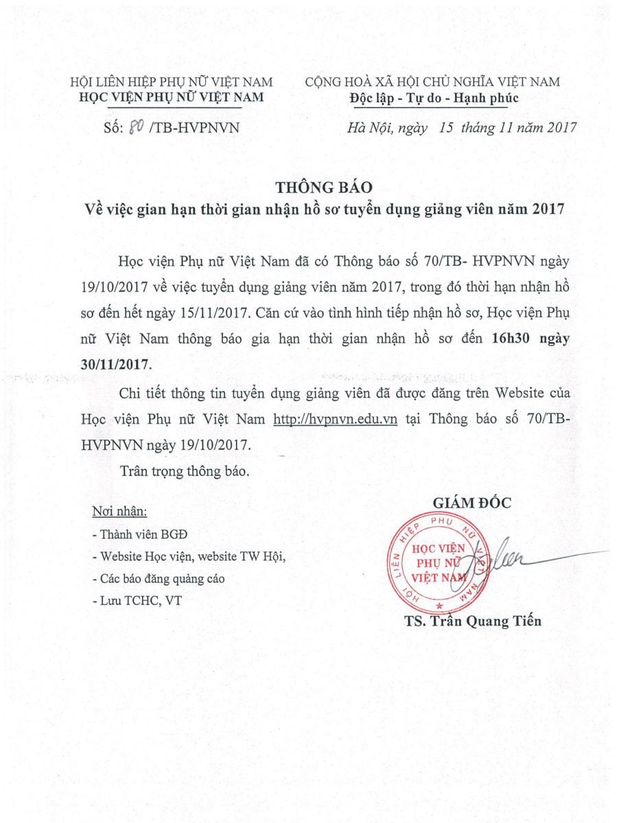Căn cứ vào chức năng, nhiệm vụ và yêu cầu thực tế; Học viện Phụ nữ Việt Nam thông báo gia hạn tuyển dụng giảng viên cho một số ngành đào tạo: