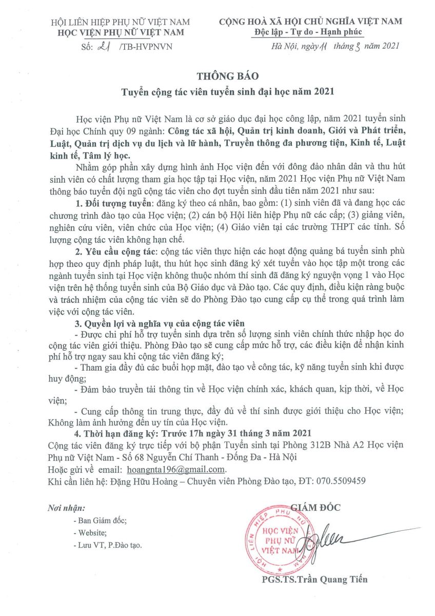 Cộng tác viên đăng ký trực tiếp với bộ phận Tuyển sinh tại Phòng 312B Nhà A2 Học viện Phụ nữ Việt Nam – Số 68 Nguyễn Chí Thanh – Đống Đa – Hà Nội