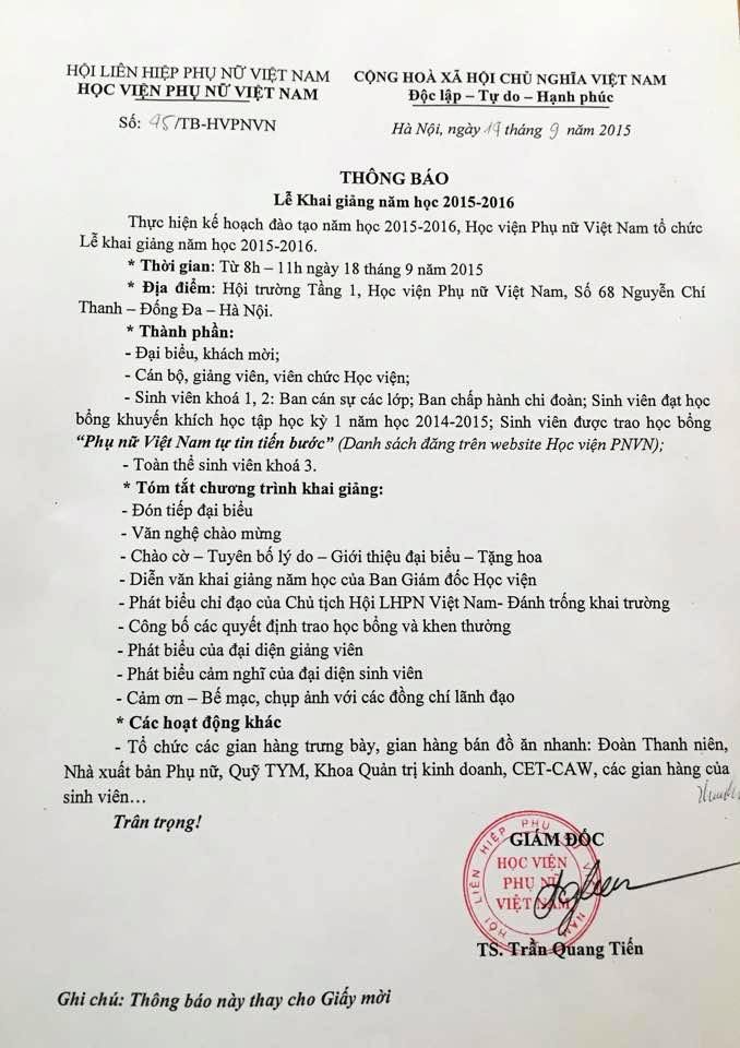 Thông báo về Lễ khai giảng năm học 2015 - 2016