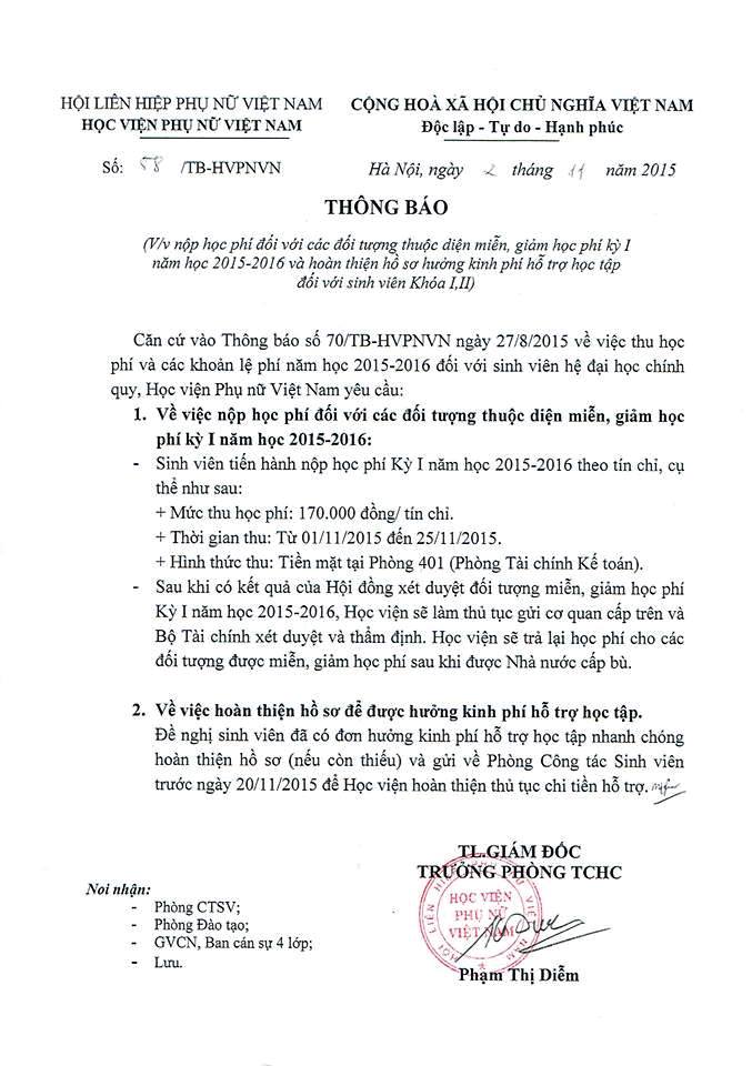 Thông báo về việc nộp học phí với các đối tượng thuộc diện miễn giảm học phí HK1