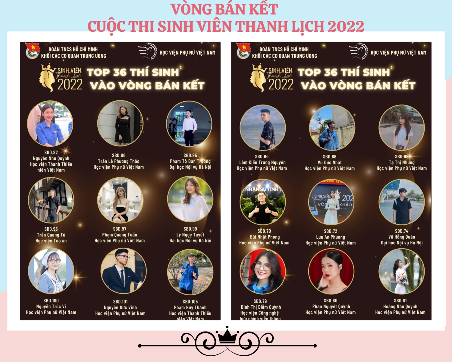 Trải qua vòng sơ khảo, 36 thí sinh xuất sắc đến từ Học viện Phụ nữ Việt Nam, Học viện Công nghệ Bưu chính viễn thông, Học viện Báo chí và tuyên truyền, Học viện Thanh thiếu niên Việt Nam, Đại học Tài nguyên môi trường, Đại học Nội vụ Hà Nội bước vào vòng bán kết.