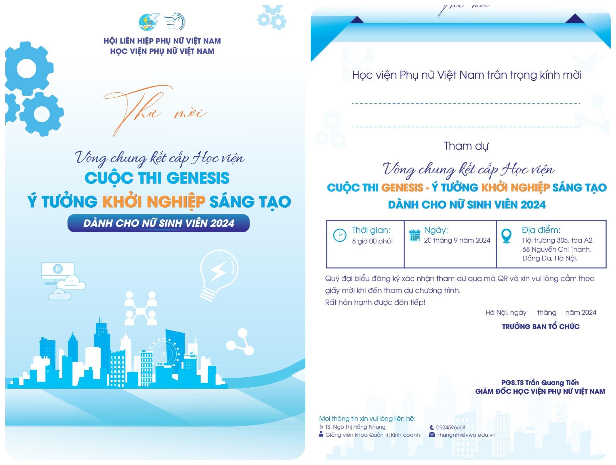 Trân trọng kính mời các đại biểu và các bạn sinh viên tới tham dự vòng chung kết cấp Học viện cuộc thi “Genesis – Ý tưởng khởi nghiệp sáng tạo dành cho nữ sinh viên năm 2024” vào lúc 8h ngày 20/9/2024 tại phòng 305, nhà A2, Học viện Phụ nữ Việt Nam.